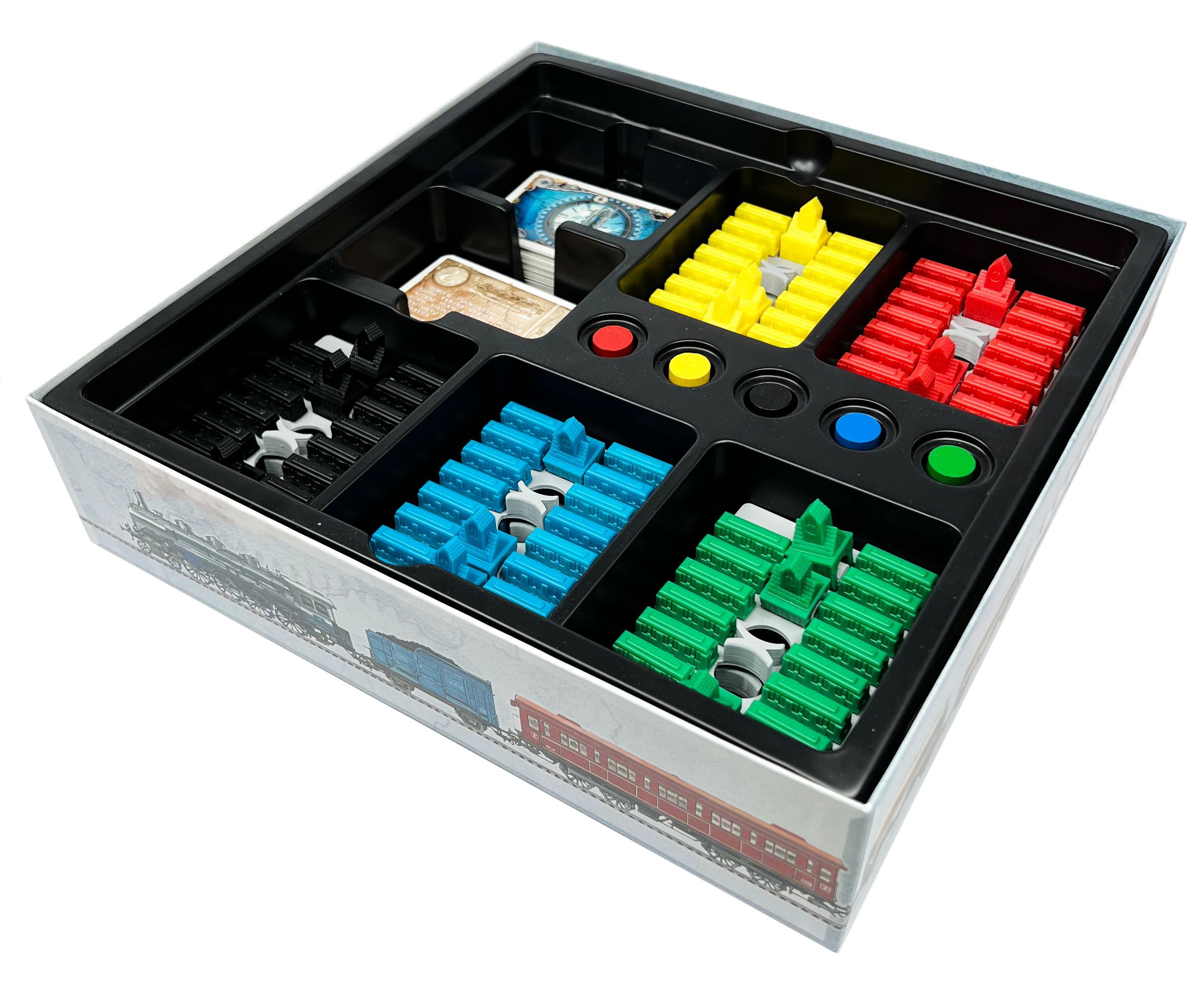 - The figure trays are compatible with the wagons and station buildings from the “Ticket to Ride” base game.