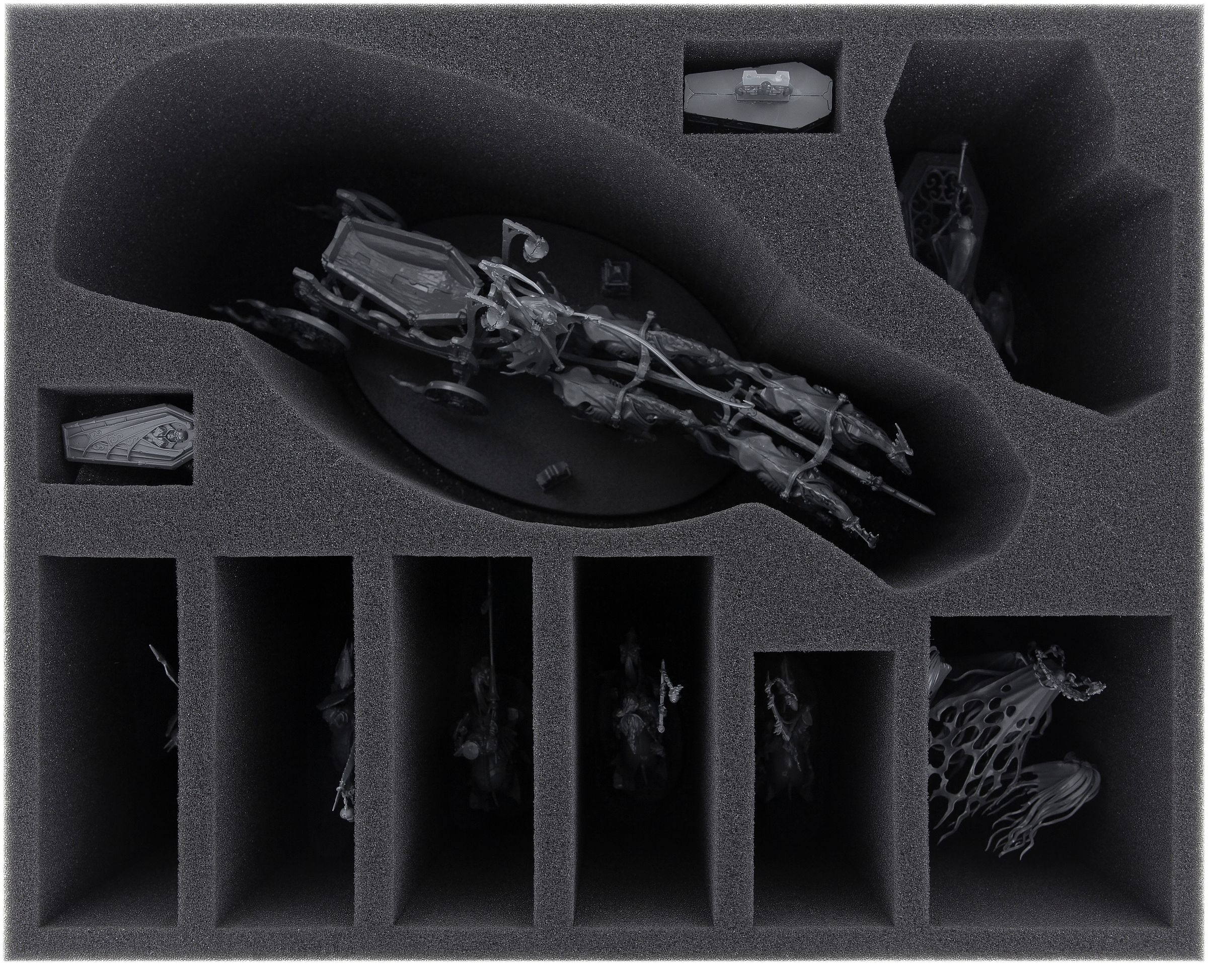 Tanto si se trata de Black Coach como de Bladegheist Revenants, cada miniatura recibe un compartimento a medida. El compartimentos cortado a medida y fabricado en espuma blando protege de forma fiable tu miniaturas de posibles daños y garantiza que tus unidades pintadas lleguen sanas y salvas al tablero sin arañazos.