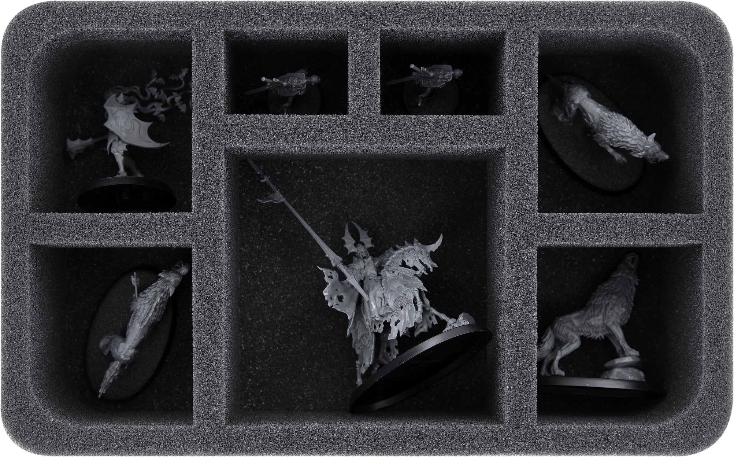 En esta bandeja de espuma Feldherr tienes espacio para hasta 7 miniaturas de tu ejército. El inserto es especialmente adecuado para guardar al Rey Wight en corcel esquelético, a los lobos huargos, a los zombis Deadwalker, a los esqueletos Deathrattle y a modelos de tamaño similar.