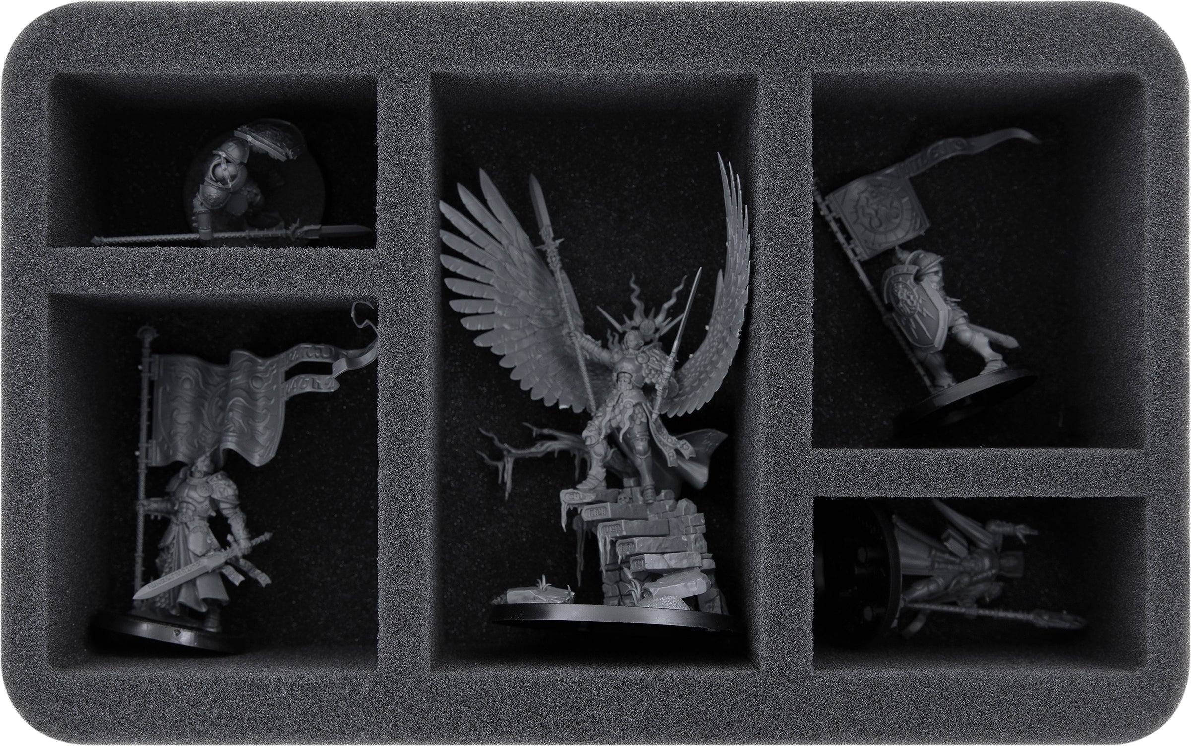 En esta bandeja de espuma Feldherr tienes espacio para hasta 5 miniaturas de tu ejército. El inserto es especialmente adecuado para guardar a Yndrasta, la Lanza Celestial, el Señor-Imperante, el Caballero-Arcanum y modelos de tamaño similar.