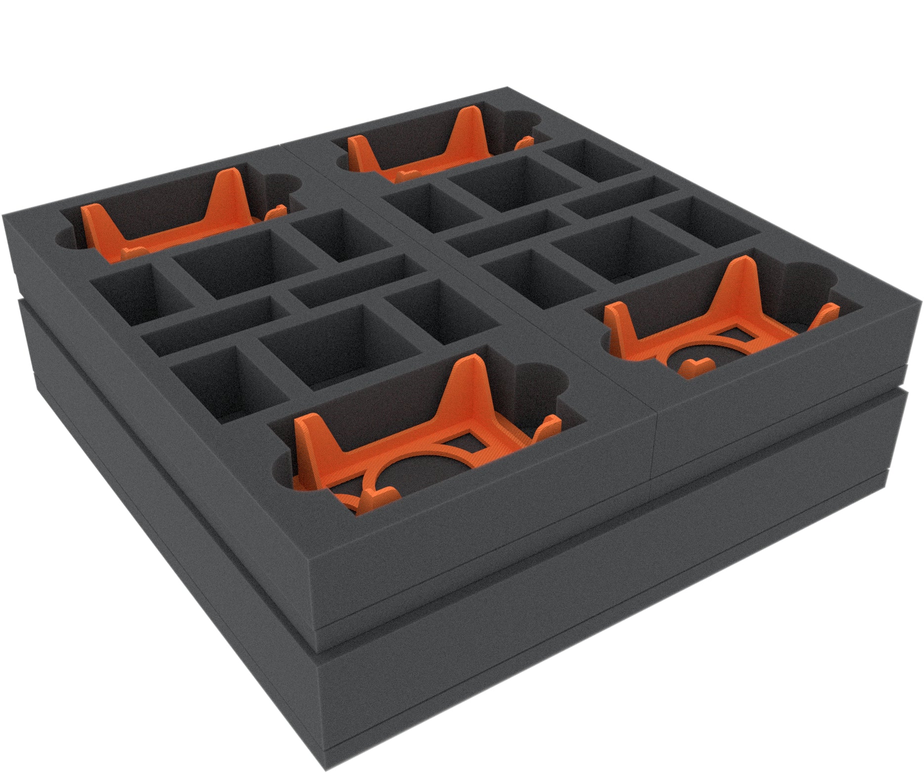 Place the two identical foam trays on top of the large insert. Here you'll find 12 rectangular compartments to store your game material from the core game, Kickstarter Pledges, and Kickstarter Exclusive miniatures. Protected by the soft, fine-pored foam, you won't have to worry about broken pieces, chipped paint, or scratches on your painted figures.
