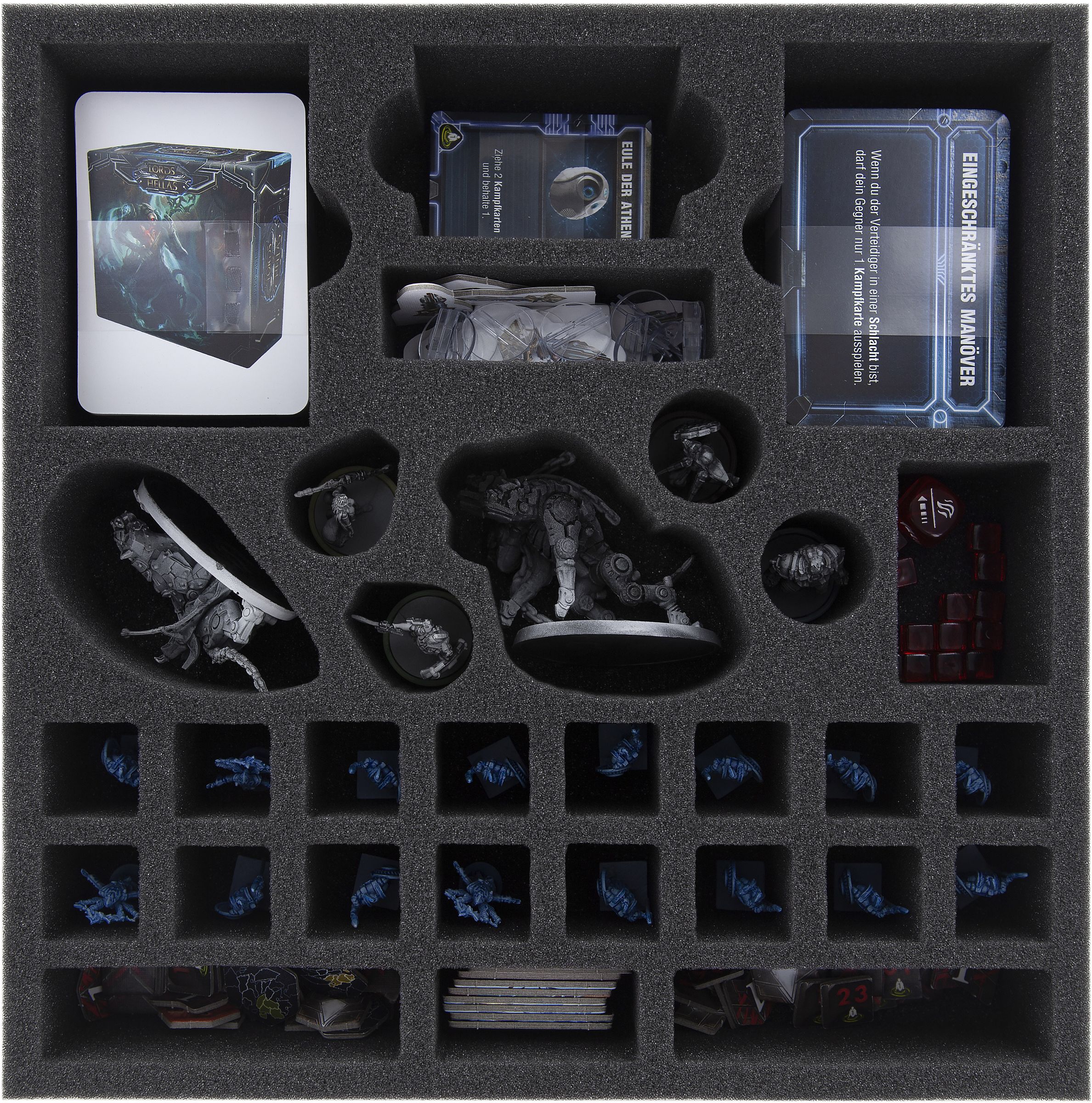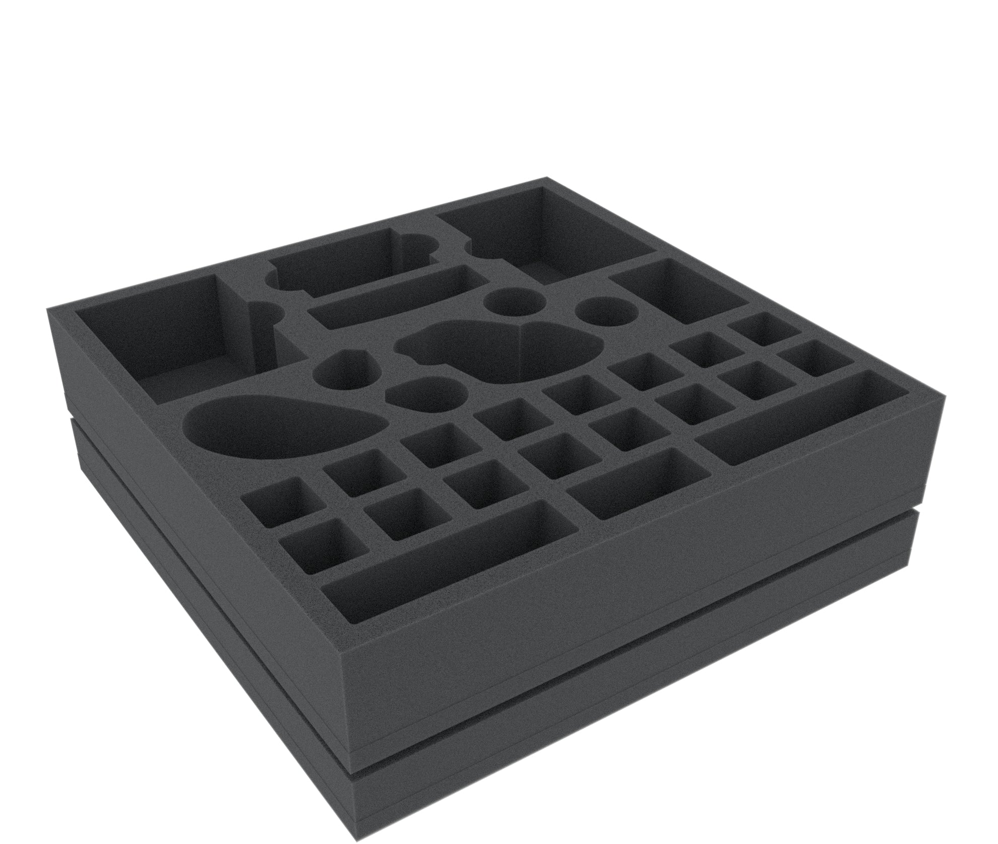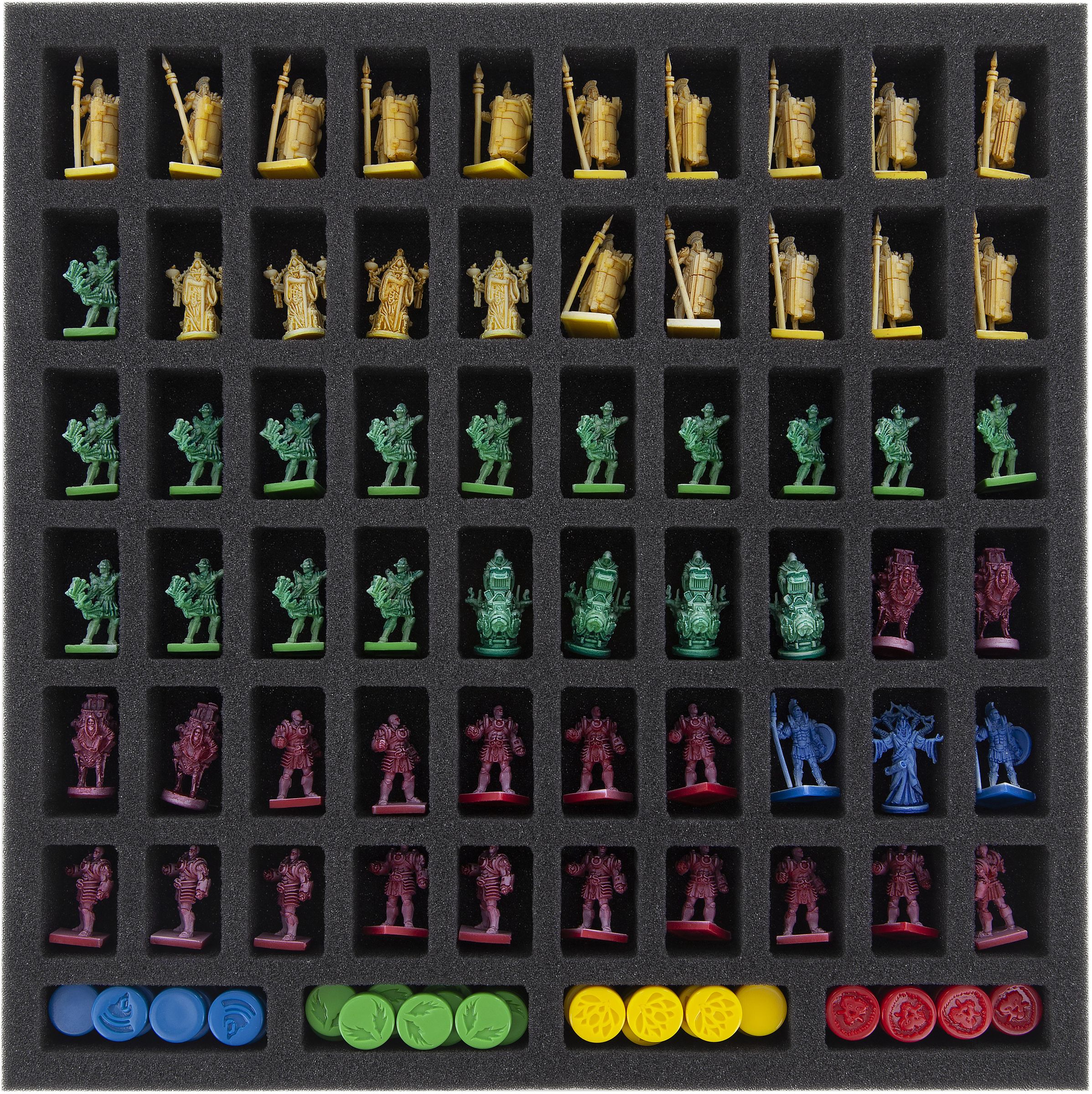 Somit wären alle Miniaturen und das Spielmaterial in den Schaumstoffeinlagen übersichtlich und bestens geschützt verstaut. Um die Schaumstoffmatten besser zu lagern und für einen leichteren Transport, empfehlen wir die Lagerbox LBBG für Brettspiele.