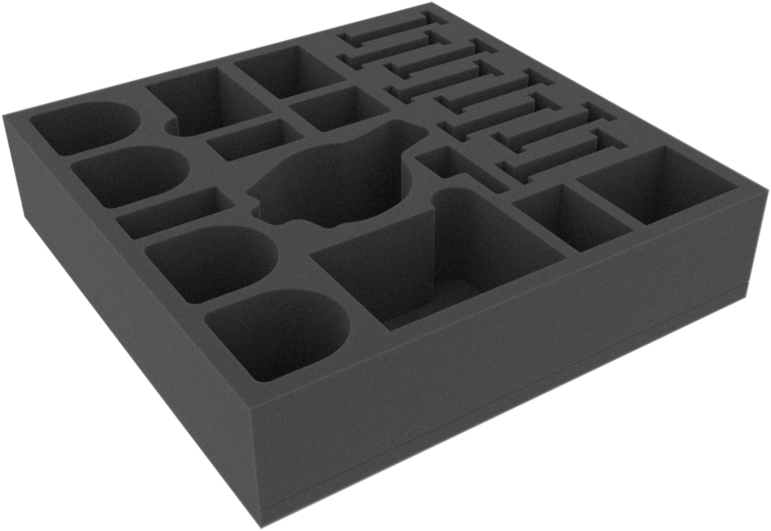 The foam tray has the dimensions: 285 mm x 285 mm x 65 mm total height (55 mm usable height + 10 mm foam base).