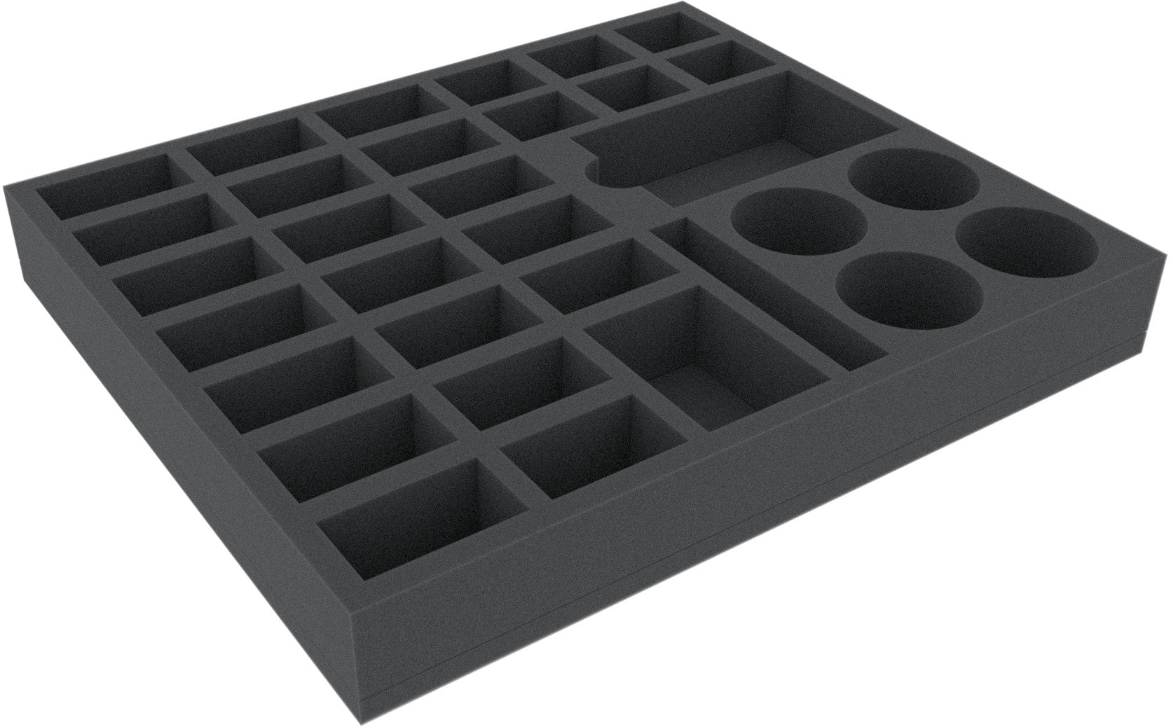 This foam tray has 32 compartments for the safe and orderly storage of tokens, markers, dice, cards, and/or small miniatures. It fits many original game boxes.