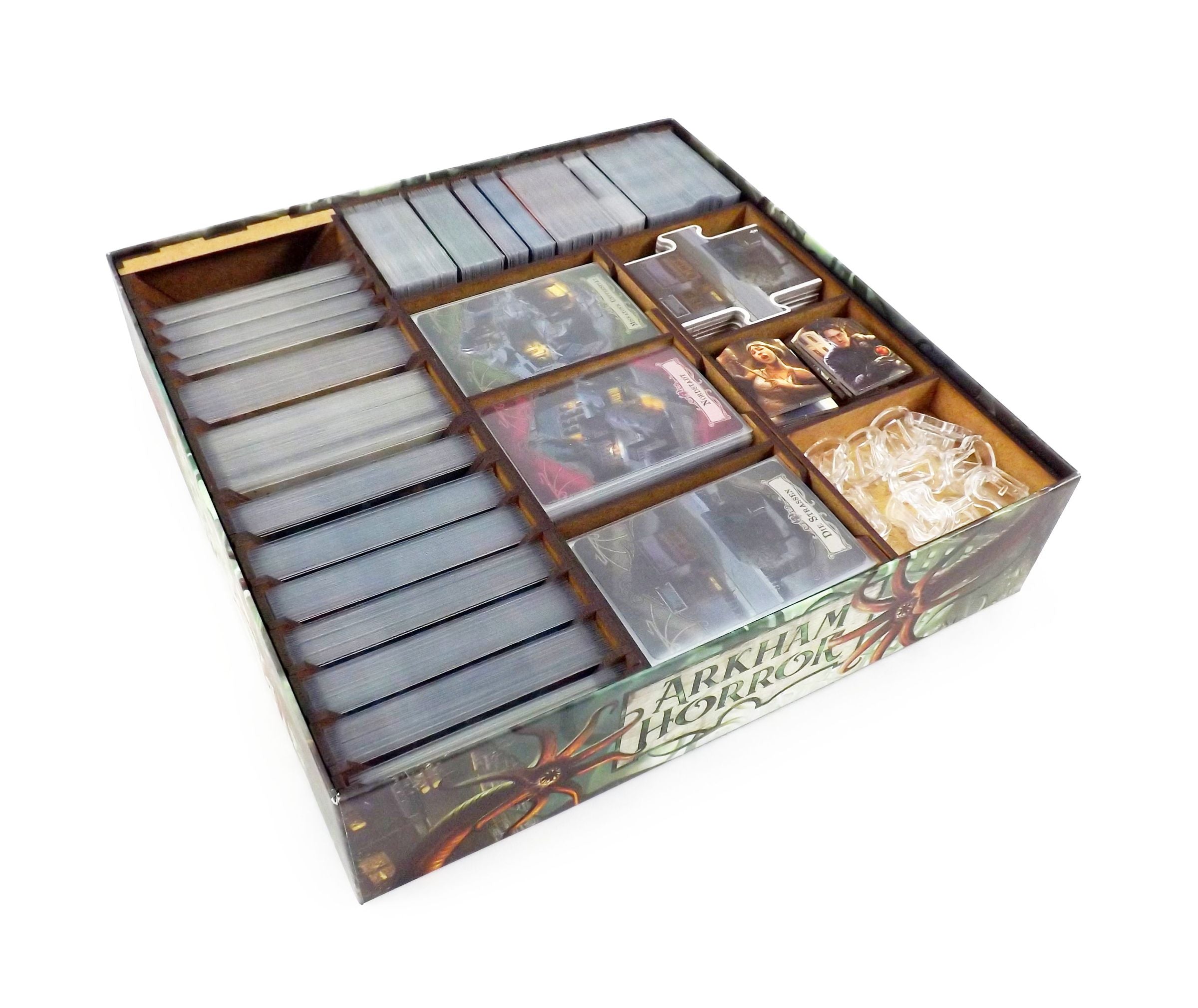 You want to pit yourselves against the incomprehensible eminence of cosmic horror with some handguns and amateur spells? You must be insane! Luckily for you, you can now gain the support of a very special artefact: our organizer with custom storage for all components makes sure the crawling chaos doesn't start in your game box.