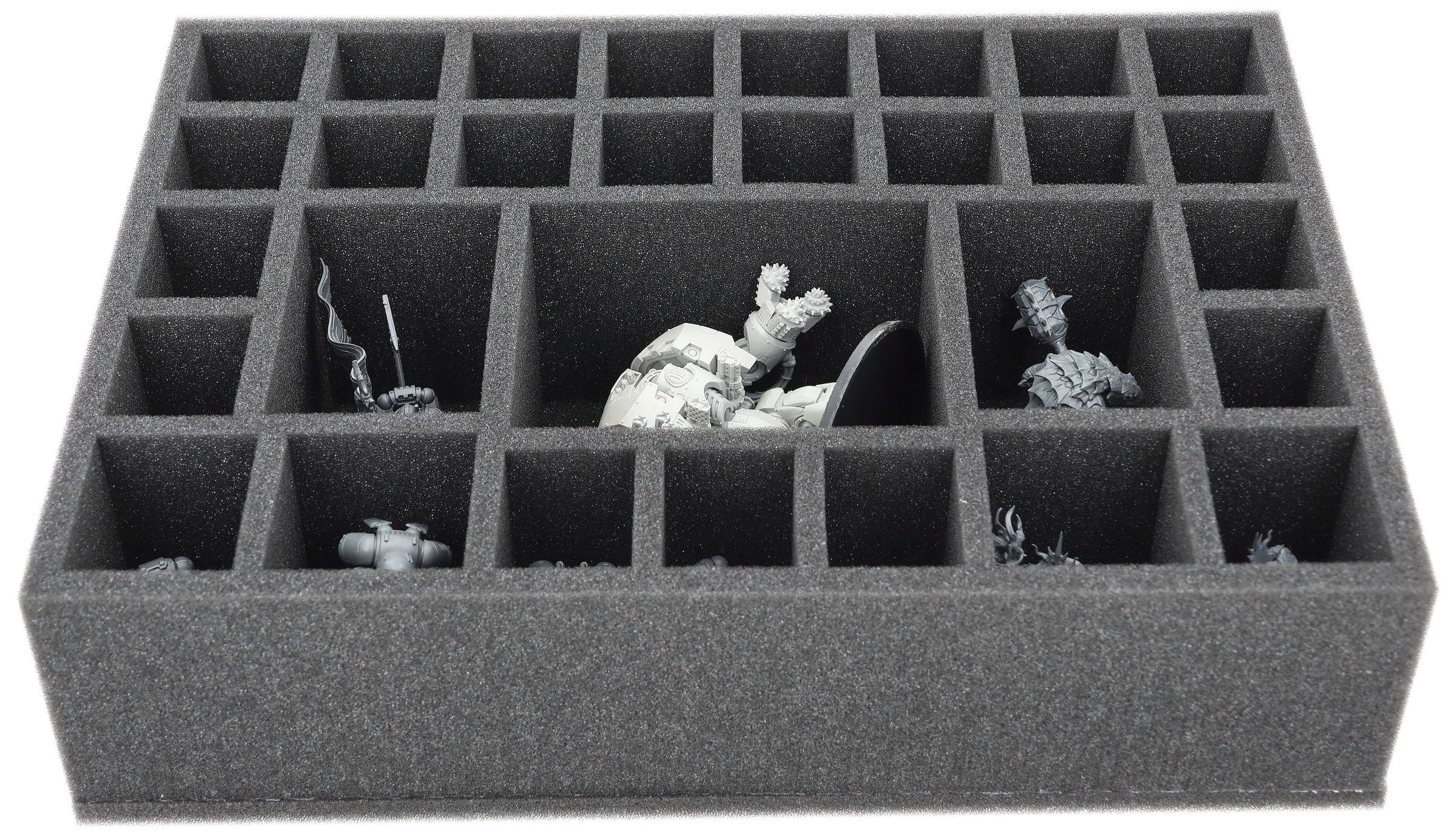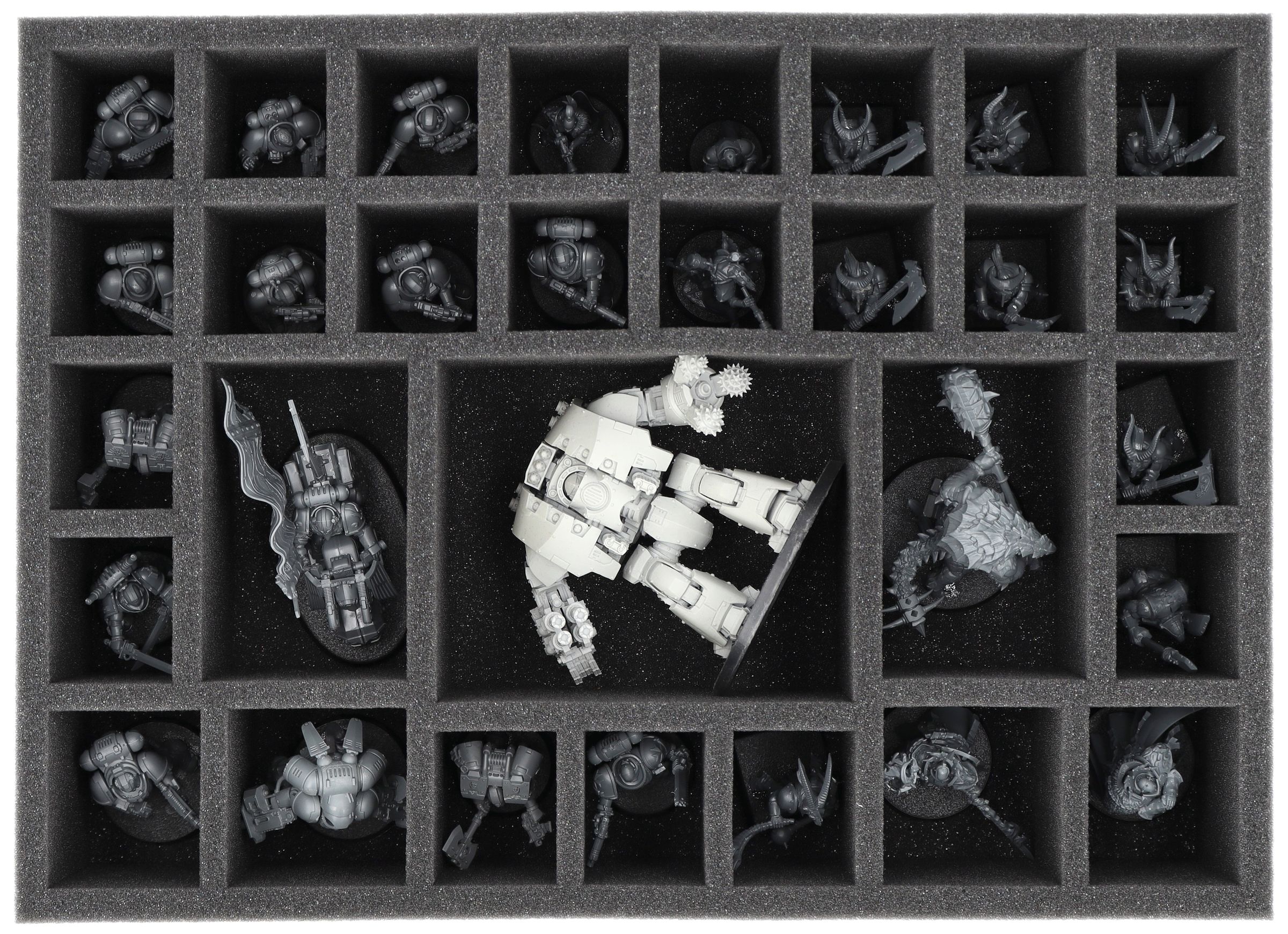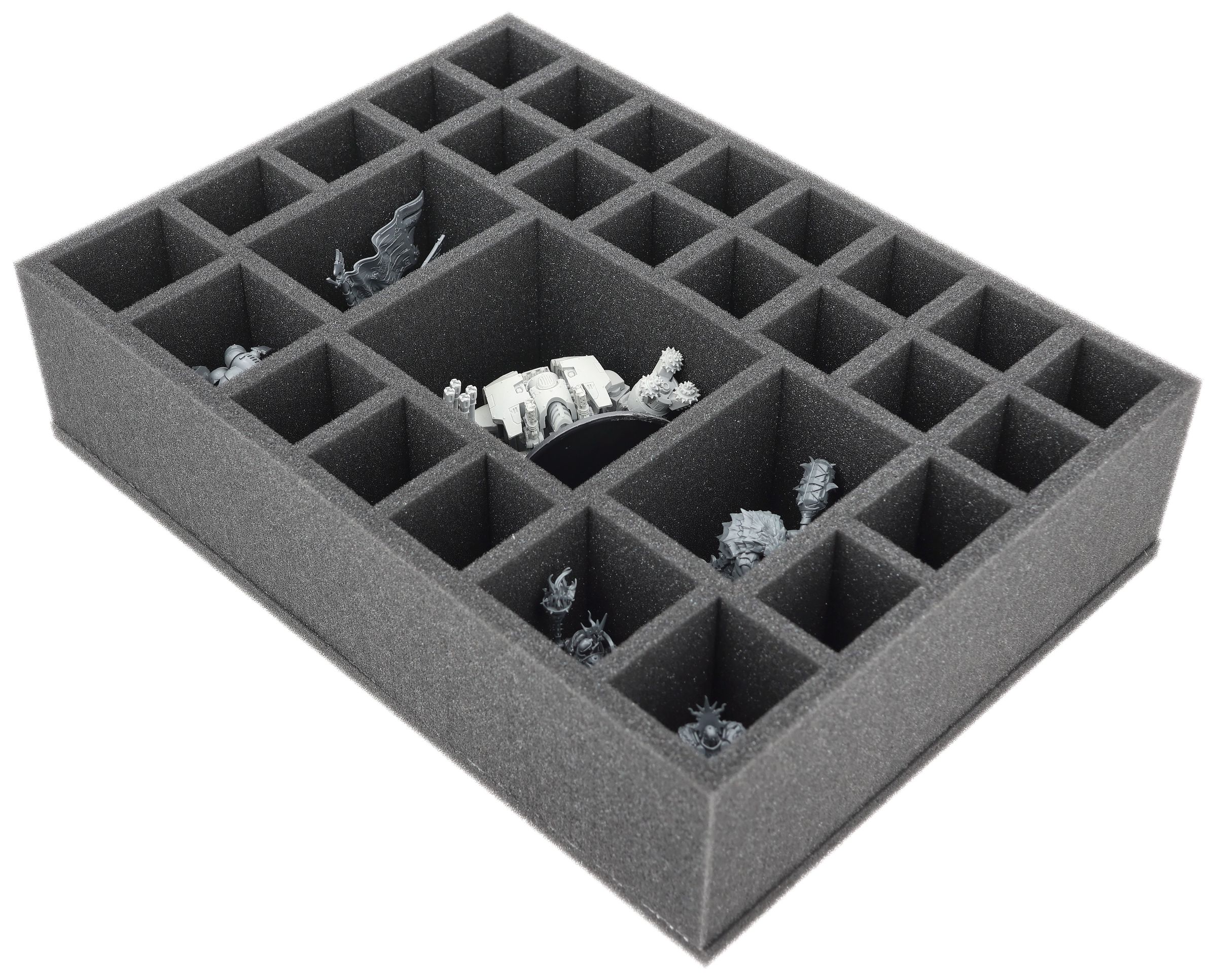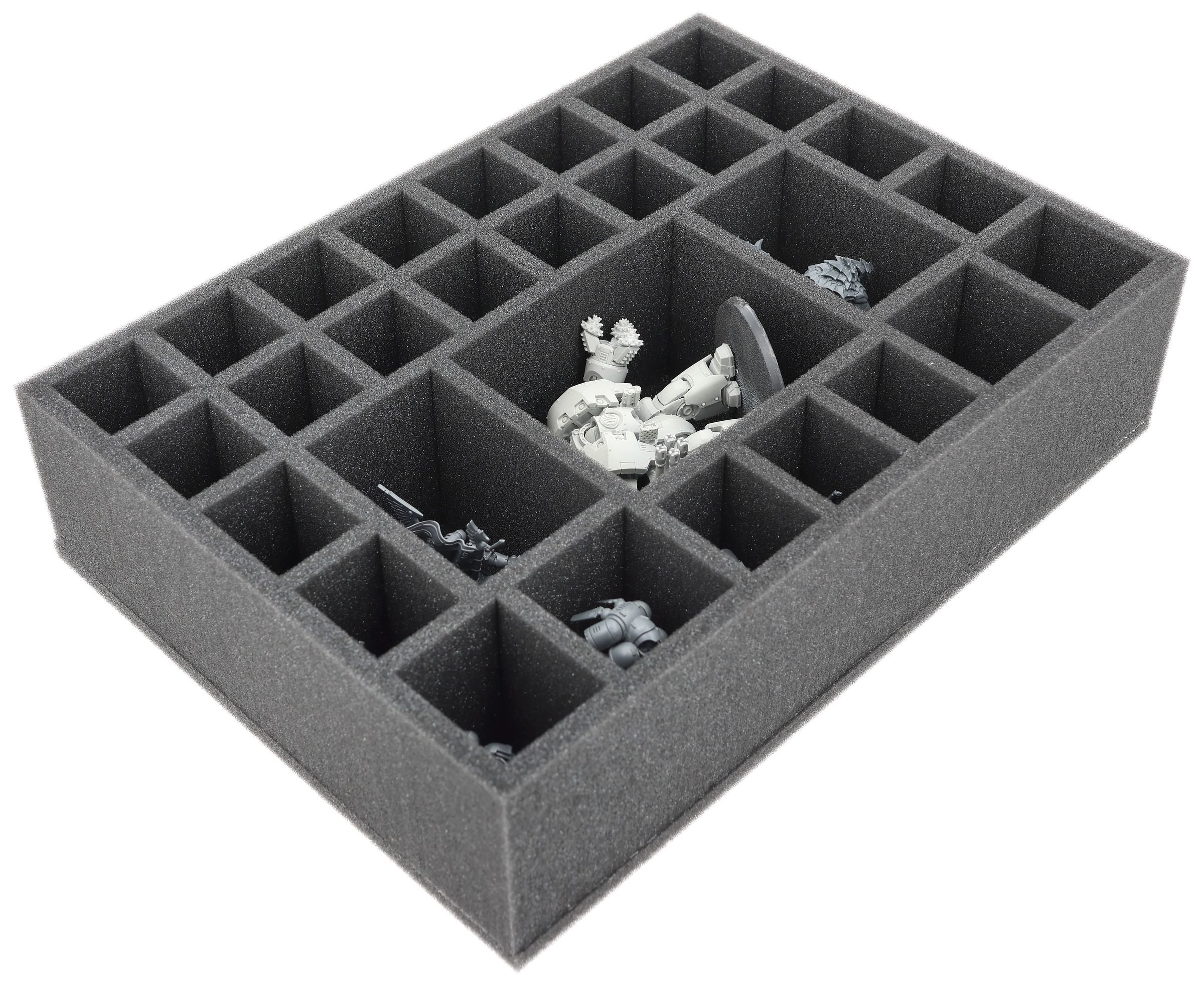 This 90 mm high Feldherr foam insert offers you 30 custom-fit compartments for the safe storage and transport of miniatures from various board game and tabletop systems. Your models remain neatly sorted and reliably protected.