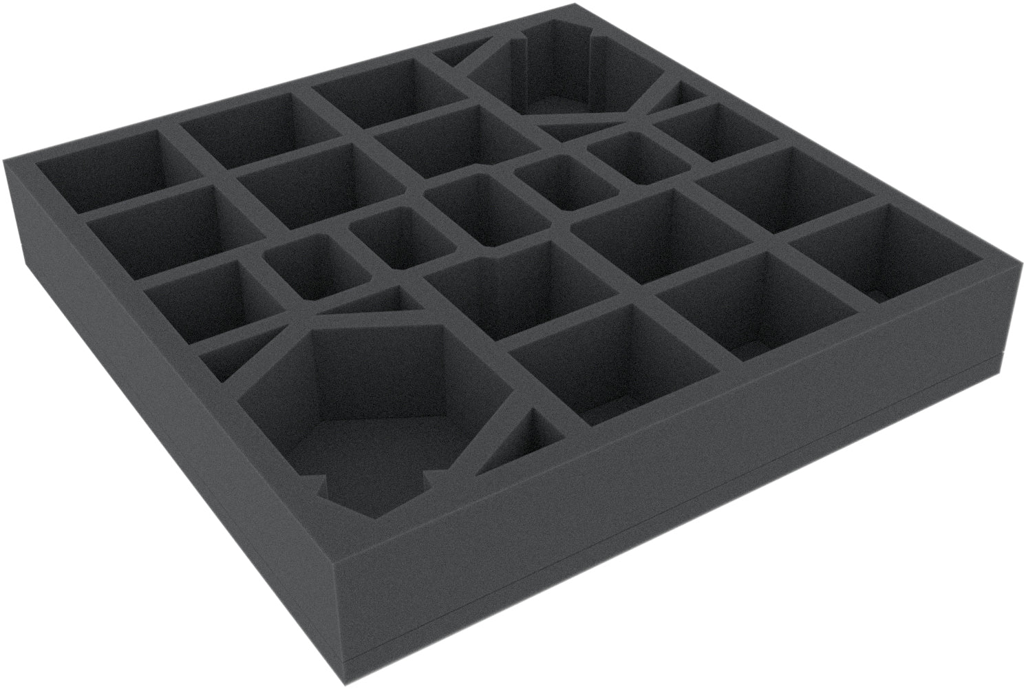 This foam insert is divided into 27 compartments of different sizes. It is particularly suitable as an insert for the safe storage of miniatures and game material in the original board game boxes (e.g. FFG).