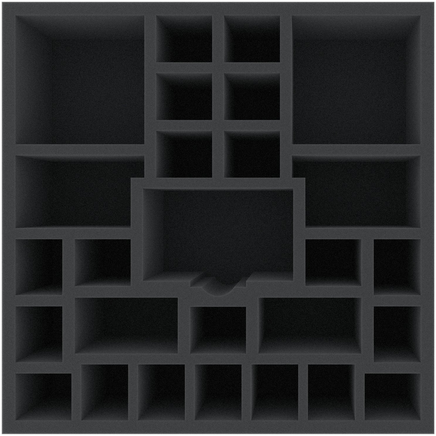 This foam tray is divided into 27 compartments. It is particularly suitable as an insert for safe storage of miniatures and game material in the original board game boxes (e.g. FFG).