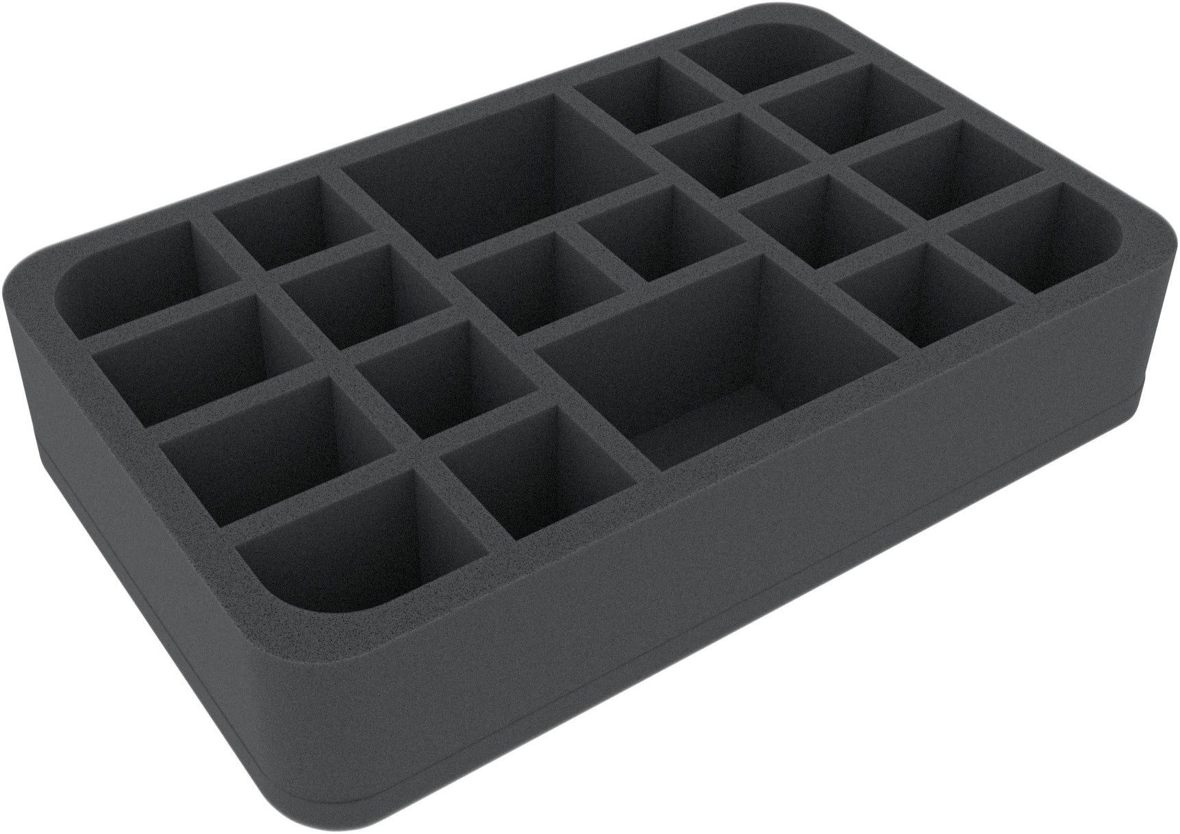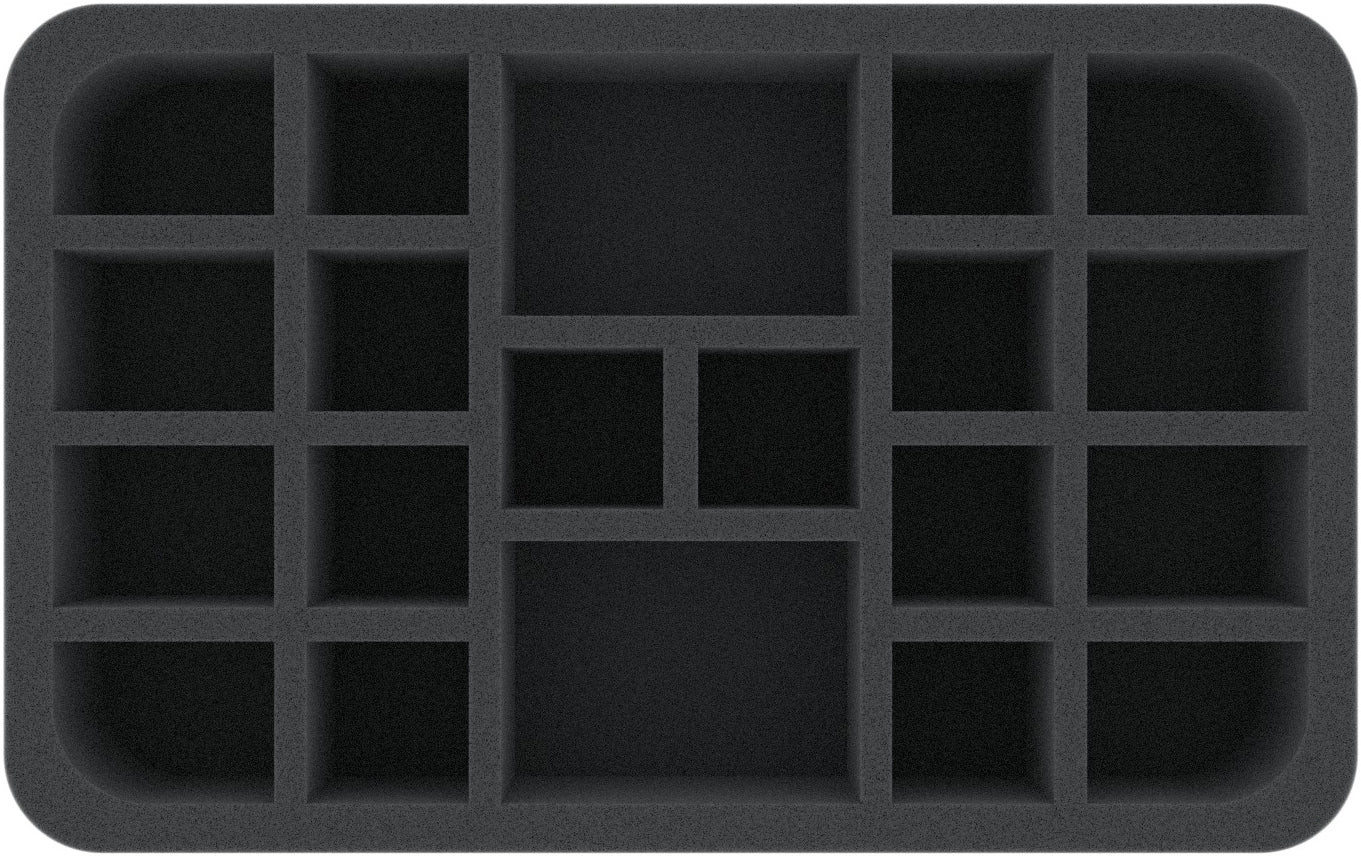 This Half-Size foam tray is divided into 20 compartments of different sizes. It is particularly well suited for the safe transport of medium-sized and small miniatures of different board games and tabletop systems.