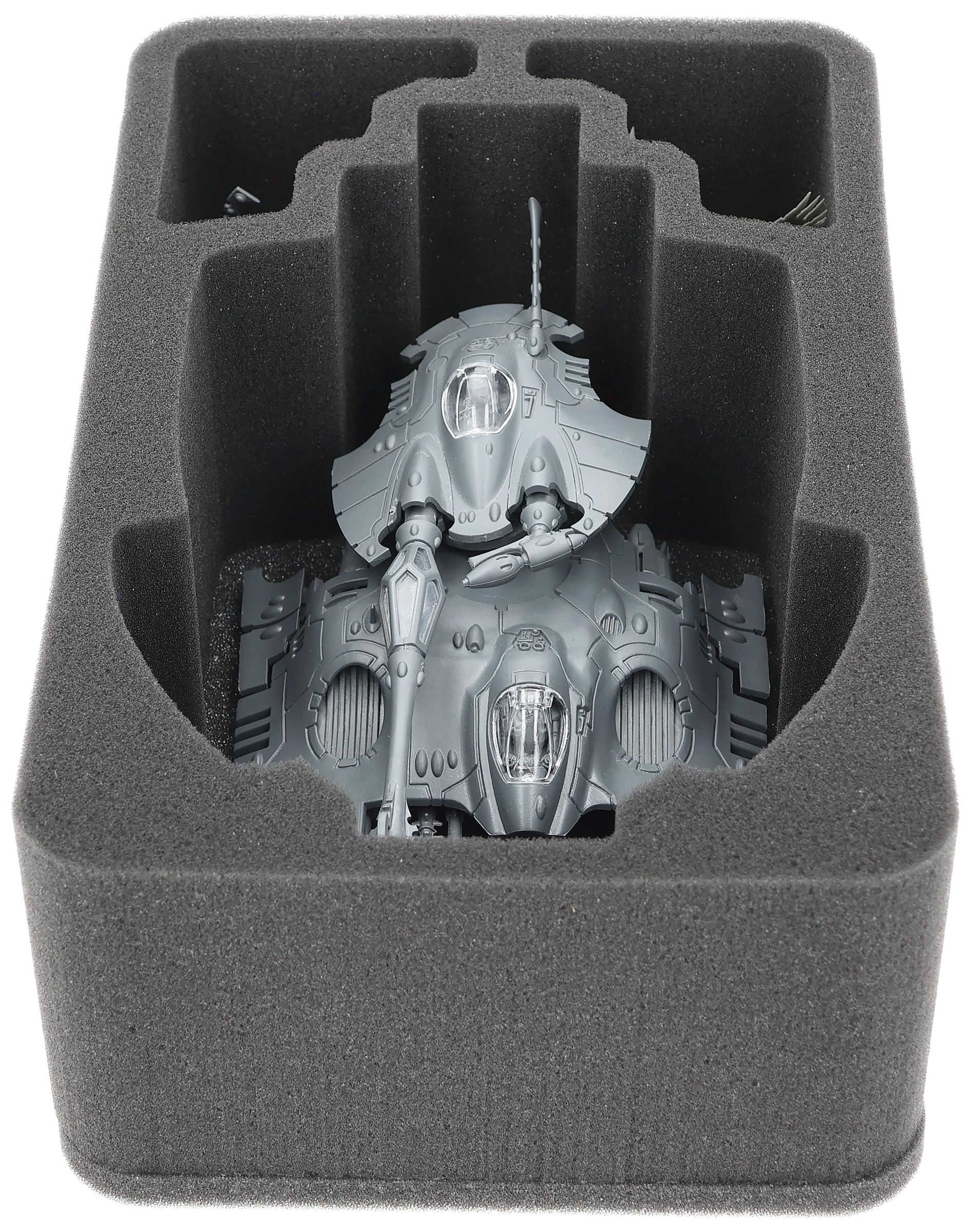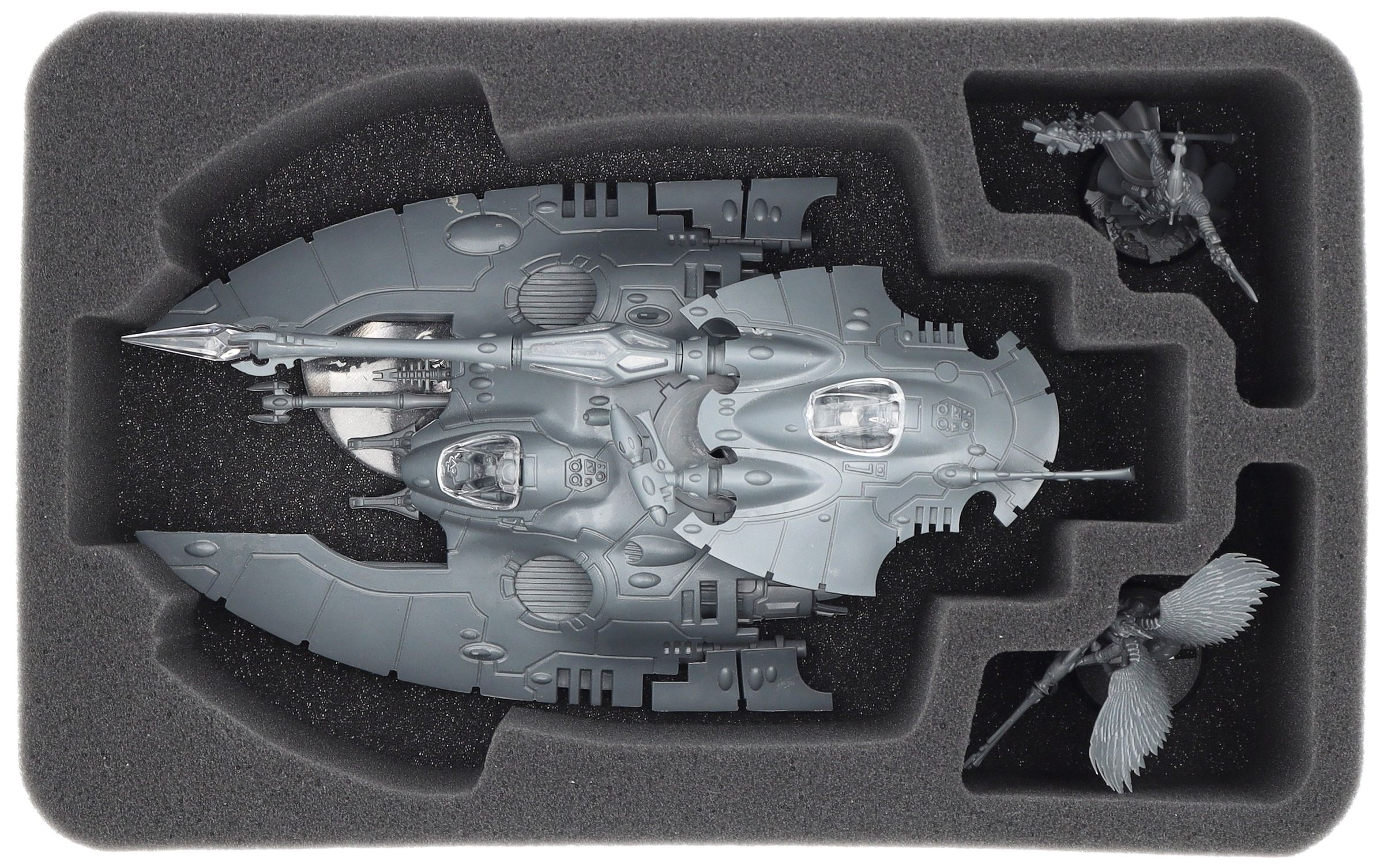 To ensure that your model can be safely stored and transported in both versions, we have designed a matching Half-Size foam insert. The large main compartment is tailored to fit the Fire Prism or Night Spinner perfectly. Two additional compartments provide space for additional Aeldari units, such as Guards, Asuryani, or escort troops on 32 mm bases.