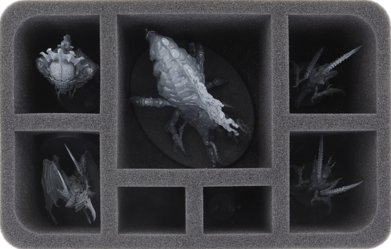 • 1 Half-Size foam tray with seven compartments for Psychophage, Neurotyrant, Winged Tyranid Prime, Von Ryan's Leapers, and miniatures of similar dimensions (HSMEME120BO)