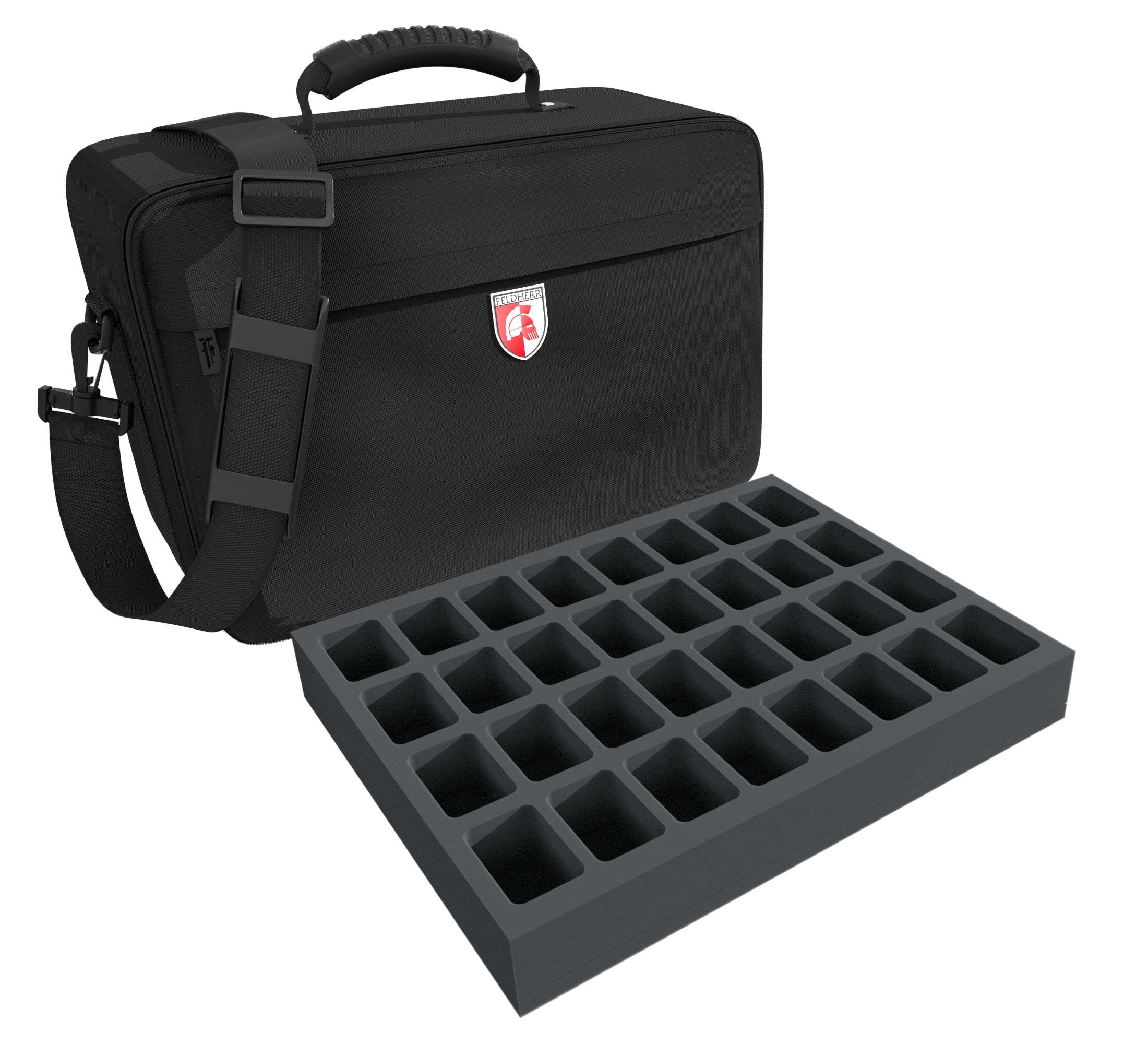 The supplied foam topper ensures that all miniatures are completely surrounded by foam and that the figures in the upper insert do not fall out of the mat during transport or rub against the fabric of the bag.