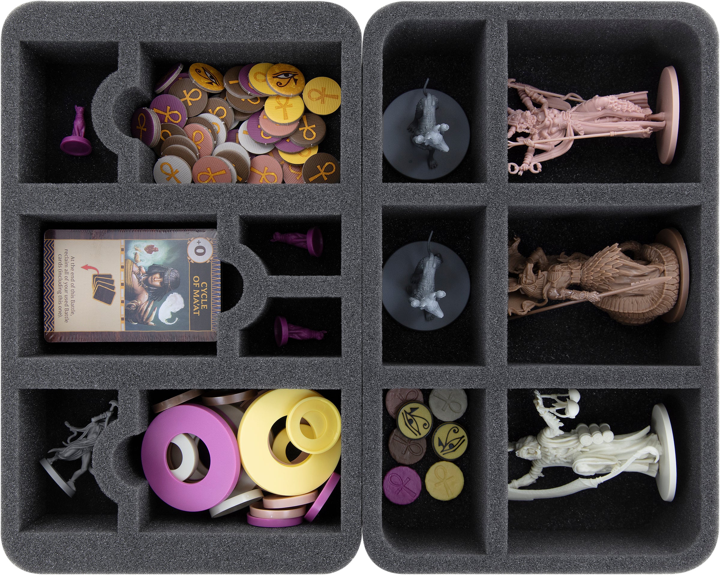 - 2 Half-Size foam trays with 6 compartments each for miniatures like Hathor, Toth, Seth, Am-Heh, Ammit, Pazuzu, Shezmu + game material (HSMFAJ070BO)