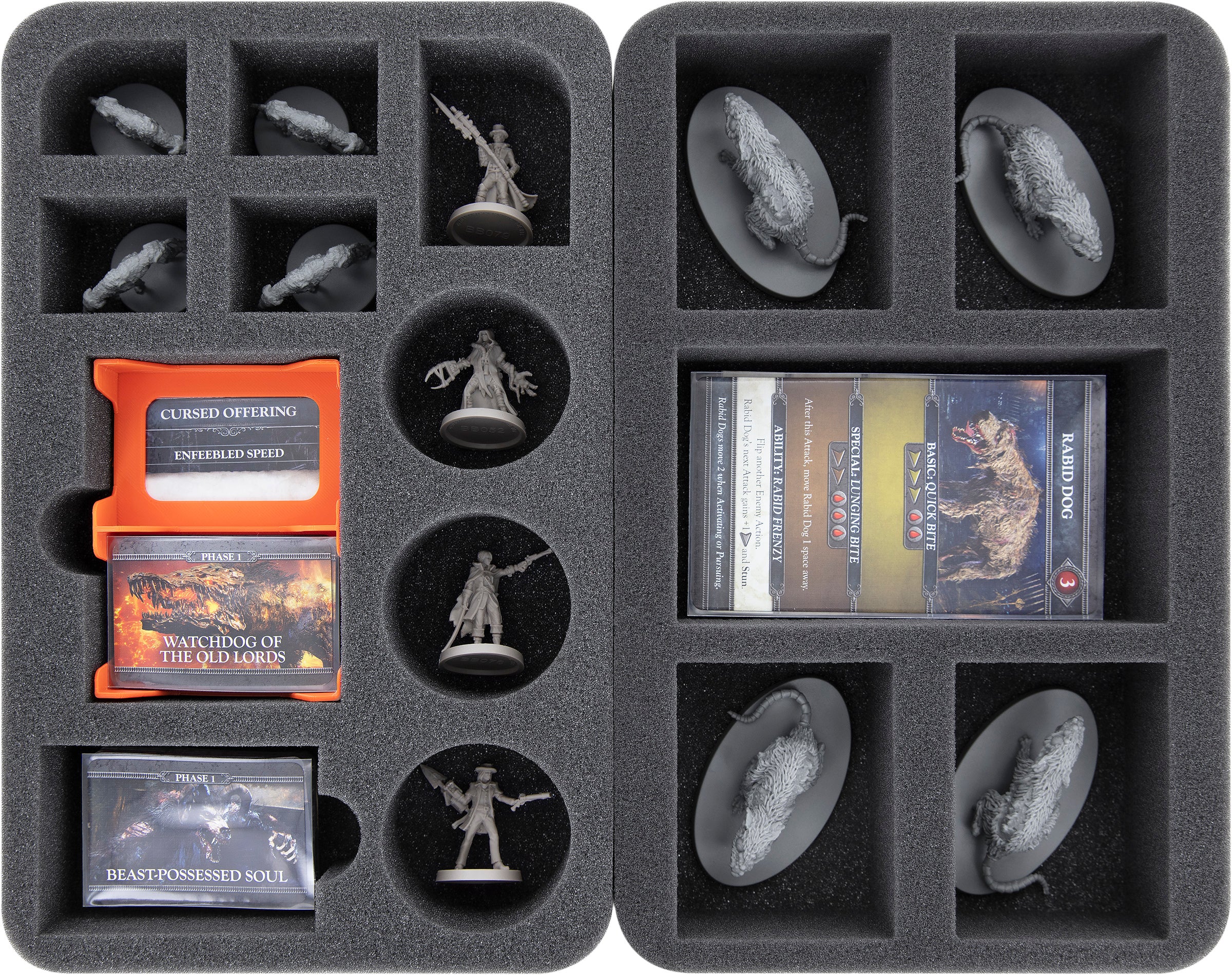 - 1 Half-size foam tray and 1 card holder for 8 miniatures + game cards (HSFW045BO + 59879)
