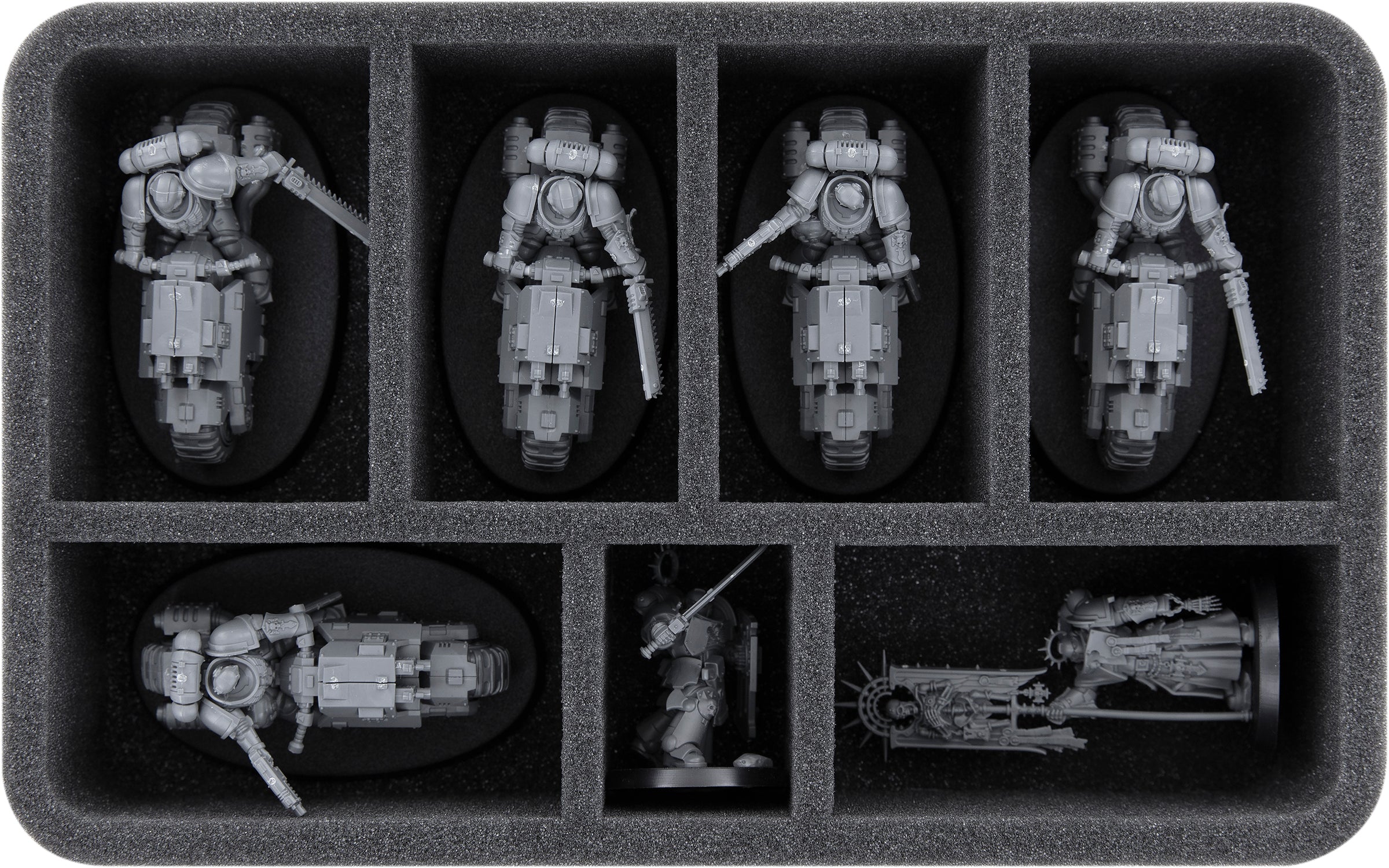 - 2 Half-Size foam trays each with 10 compartments for Primaris Aggressors, Eradicators and the Assault Squad (HS050A064)