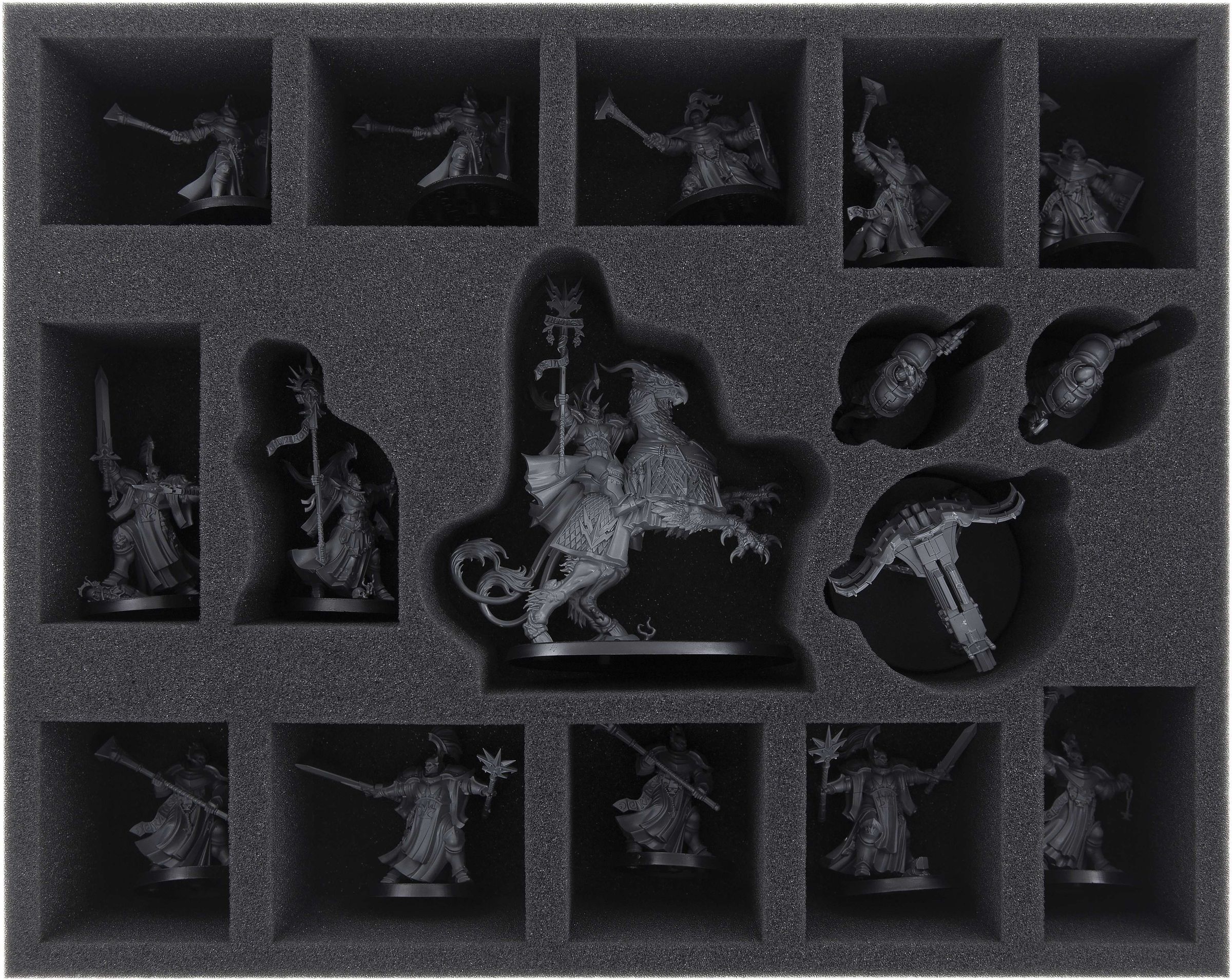 Two large foam trays provide a safe place for Sigmar's warriors after the battle. All miniatures are stored clearly arranged, in compartments specially tailored for them. Completely surrounded by soft foam, sensitive parts such as the Lord Arcanum aetherstave or the Evocators' stormstave remain optimally protected. Vexingly bending is prevented. And also, the colors of painted miniatures will not flake off. A foam topper on the upper tray provides final protection of the figures to the top.