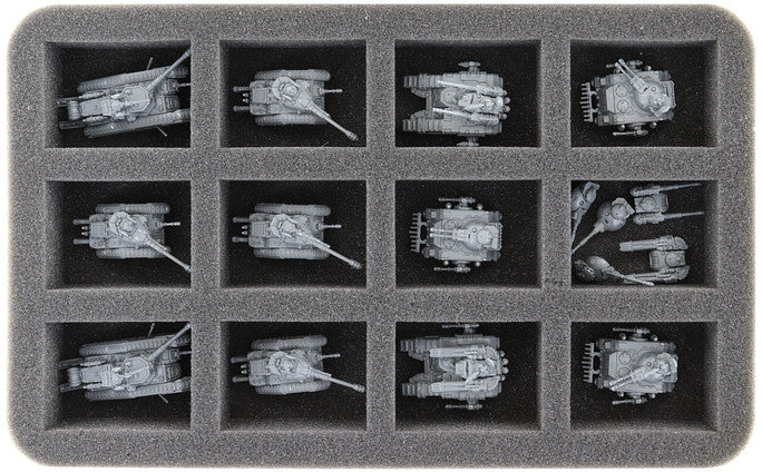 • 2 Half-Size foam trays, each with 12 compartments for armored vehicles like Sicaran, Predator, Leman Russ Battle Tanks, and miniatures with similar dimensions (HS040I012BO)