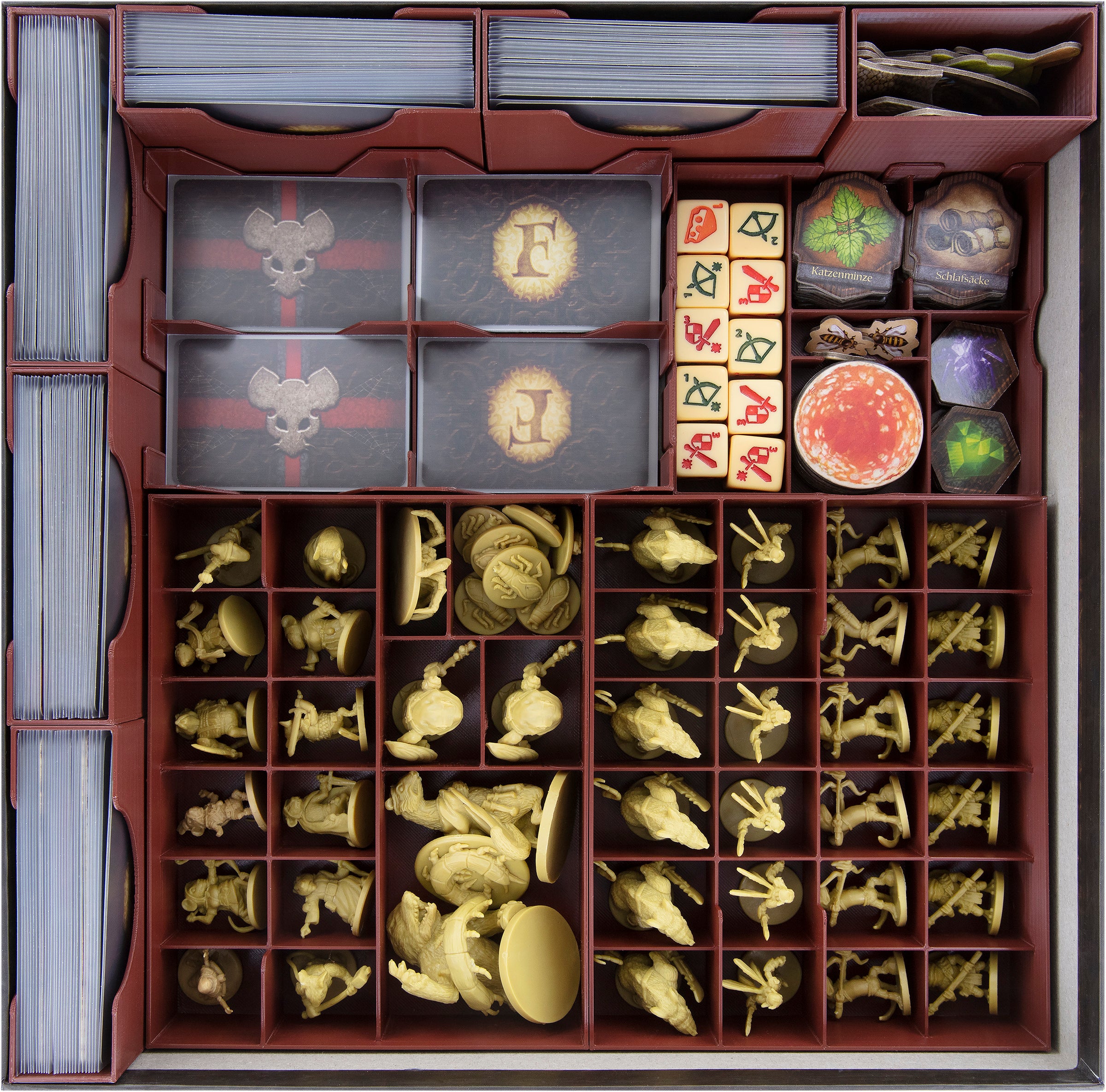 • It offers space for all miniatures, cards and the entire game material of the "Mice and Mystics" core game and the two expansions "Heart of Glorm" and "Downwood Tales".