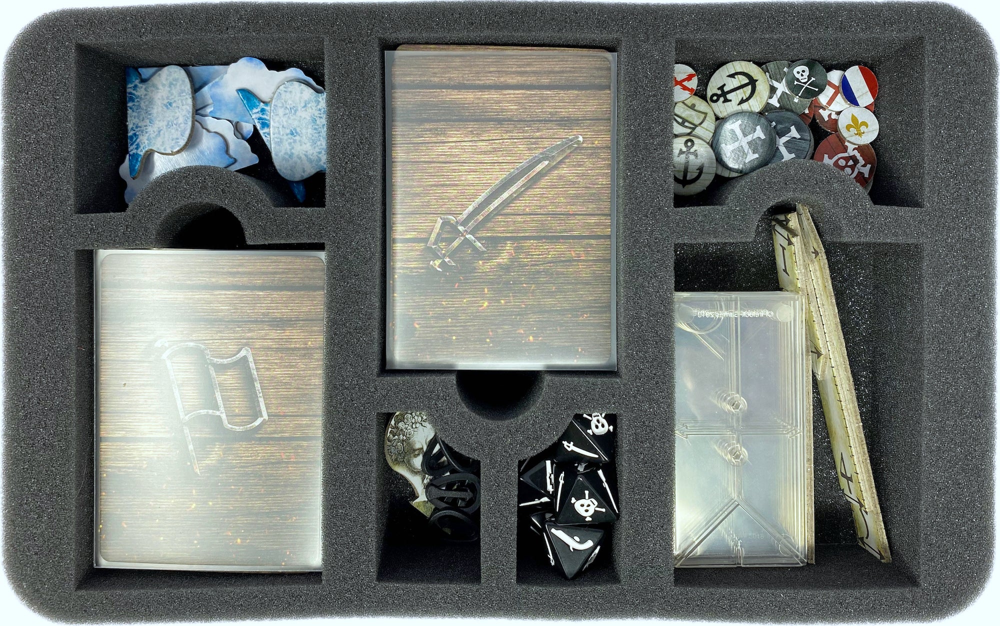 The set is completed by the matching foam toppers. The toppers are placed on top of the trays and makes sure that no game material can fall out.