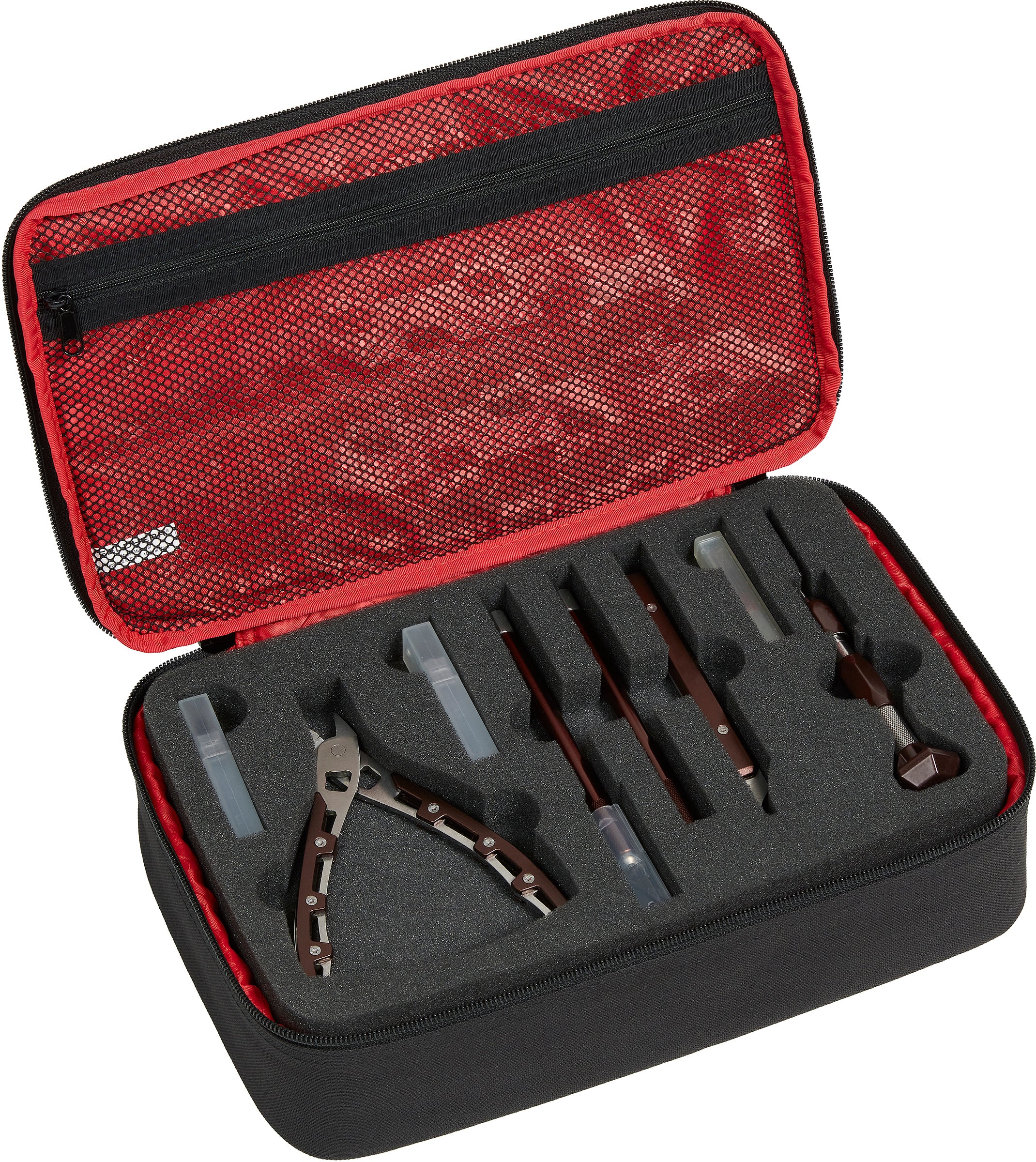 The insert is divided into 8 differently shaped compartments. The largest of these offers space for a plastic cutter. In the additional compartments, craft knives, cutters (snap off blade knives), files, drills, and tweezers can be clearly stored.
