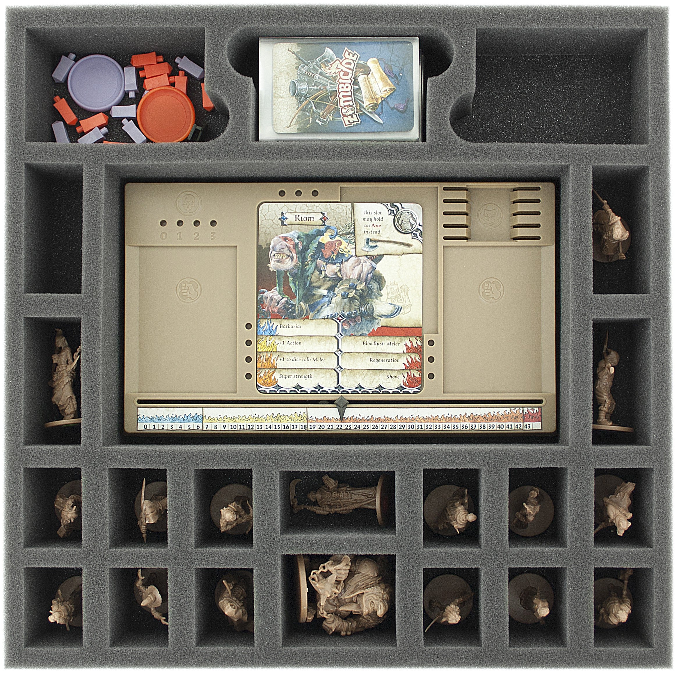 Foam tray especially for Zombicide Black Plague - Heroes. The 22 different sized compartments are suitable for all conceivable game material. So miniatures, cards, markers and dice can be kept in a well. In addition, there is included an extra foam insert, that can be used to divide the big compartment in 15 smaller compartments. The foam mat then has 36 compartments.