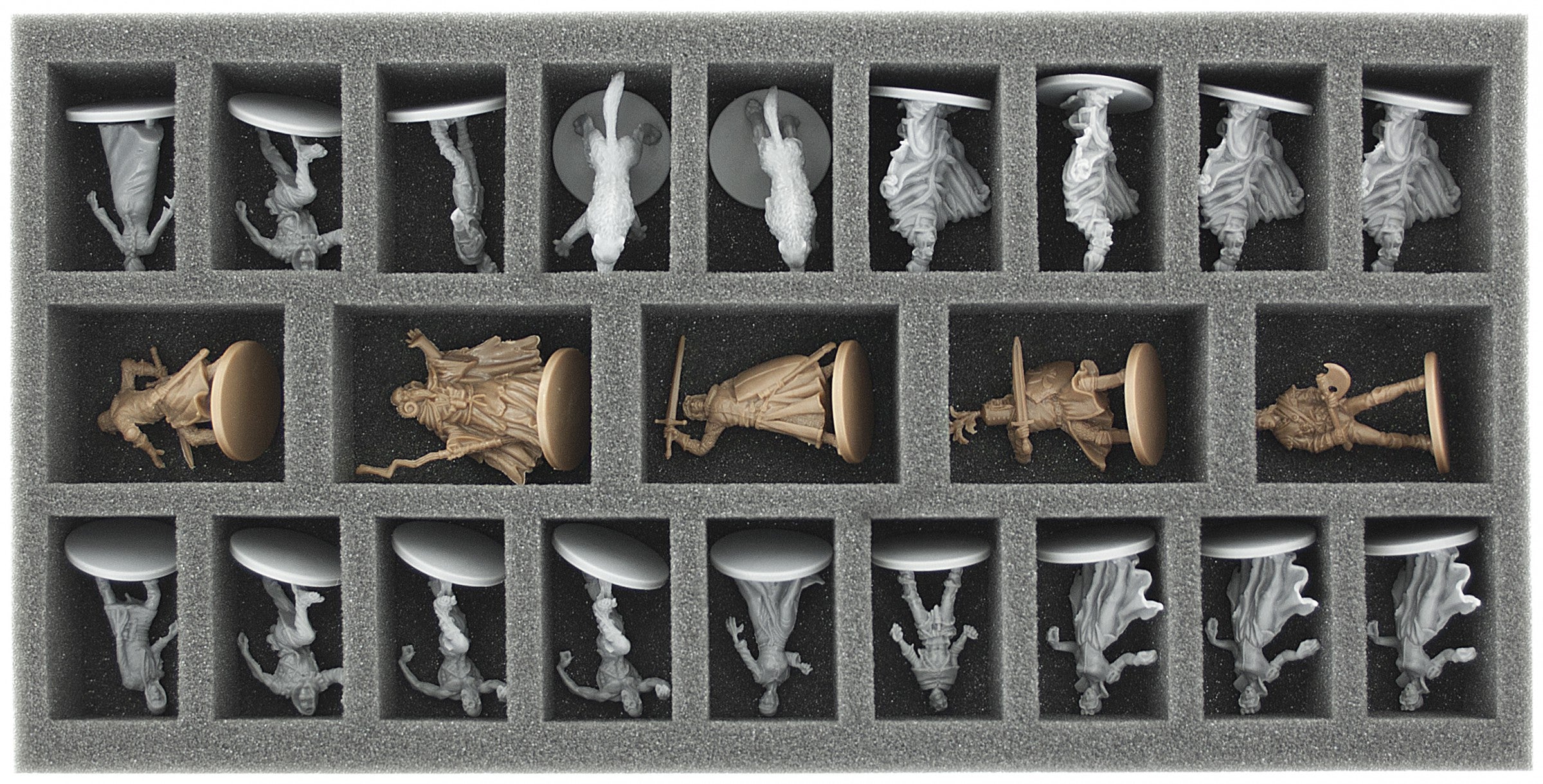Foam tray for Zombicide Zombies and Survivors. The 23 different sized compartments are good for walkers, runners fatties, necromancer, wolfz and survivors. The foam tray occupies half the ground space of the board game box. In addition, we recommend AU085ZC20 and AU050ZC21.