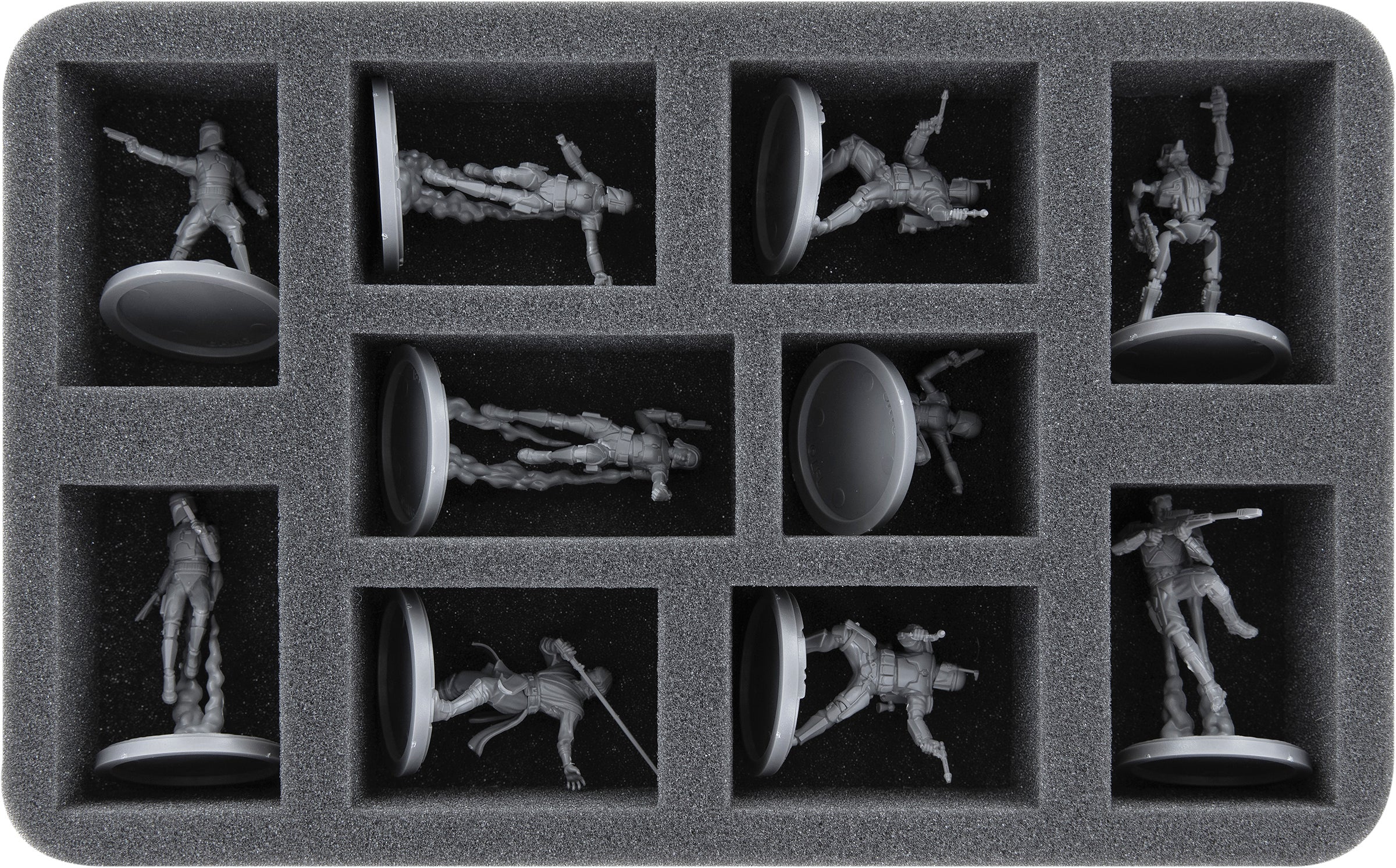 • 1 Half-Size foam tray with 10 compartments for bulky miniatures on 40 mm bases like Anakin Skywalker, Bo-Katan Kryze and miniatures with similar dimensions (HS050A134)
