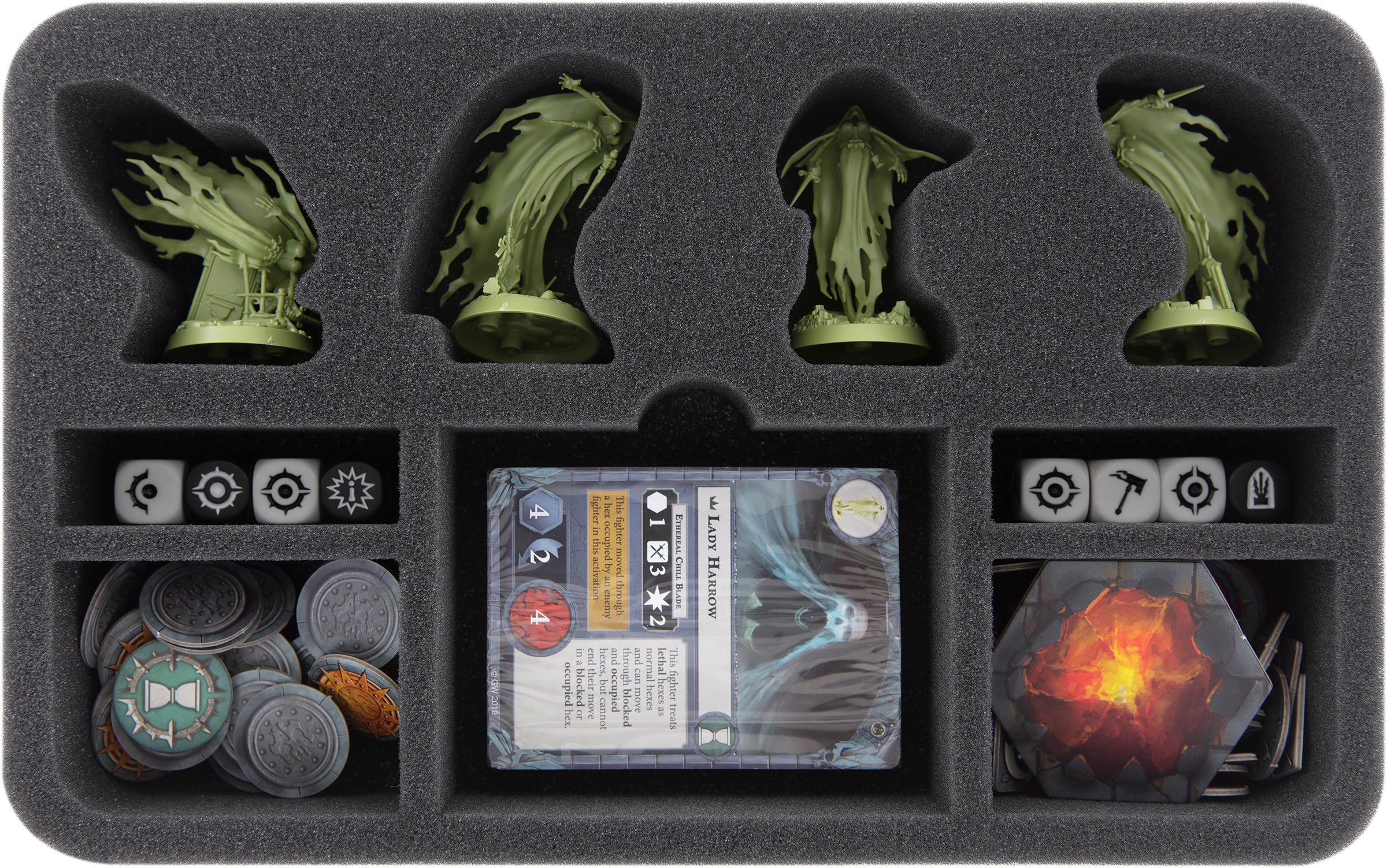 The foam tray for "Lady Harrow's Mournflight" has nine compartments. Lady Harrow and her fellow Banshees are placed into individually tailored compartments. Of course, this tray features a compartment for up to 40 (sleeved) cards or the Warhammer Underworlds deck box, as well. Dice and tokens are sorted into the remaining four compartments.