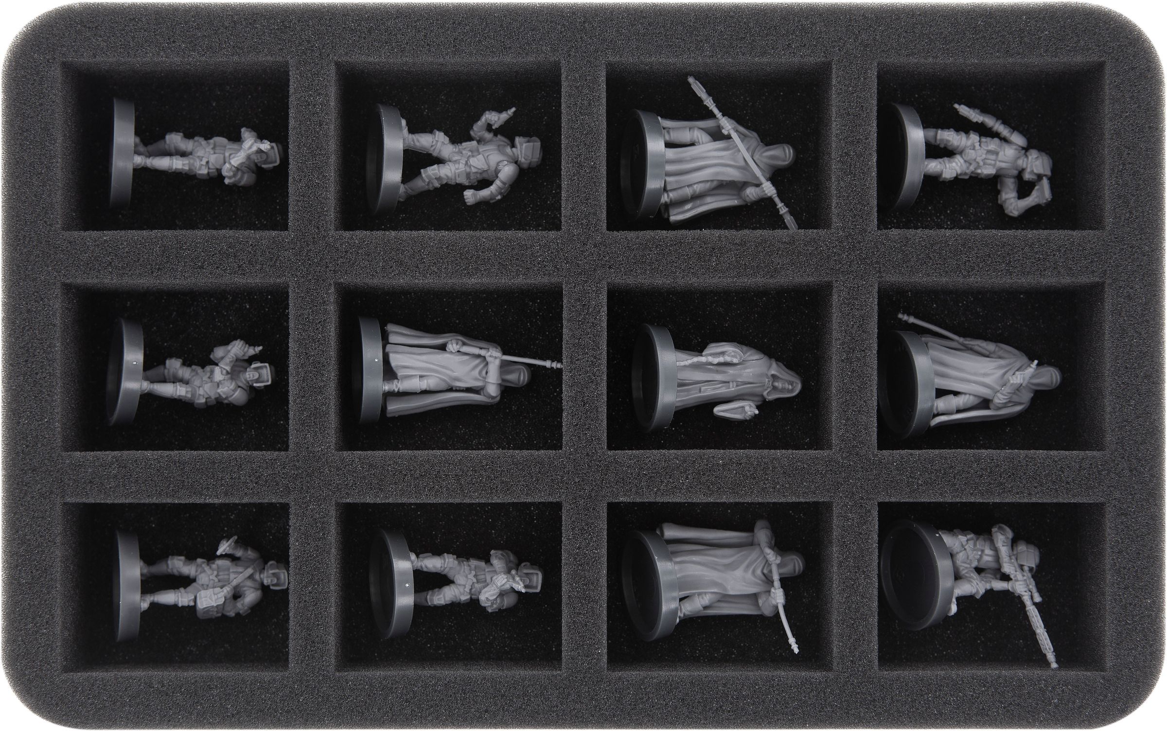 This Feldherr foam tray has 12 same-sized compartments for the clear and safe storage of wargaming miniatures in scale 1:56 (28 mm). The tray is thus ideally suited for miniatures of e. g. the games "Infinity The Game", "Warpath" or “Bolt Action".