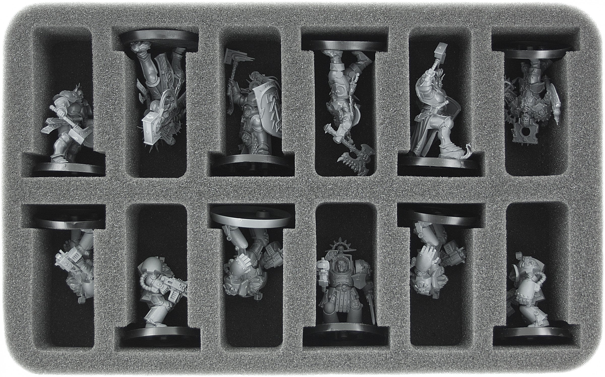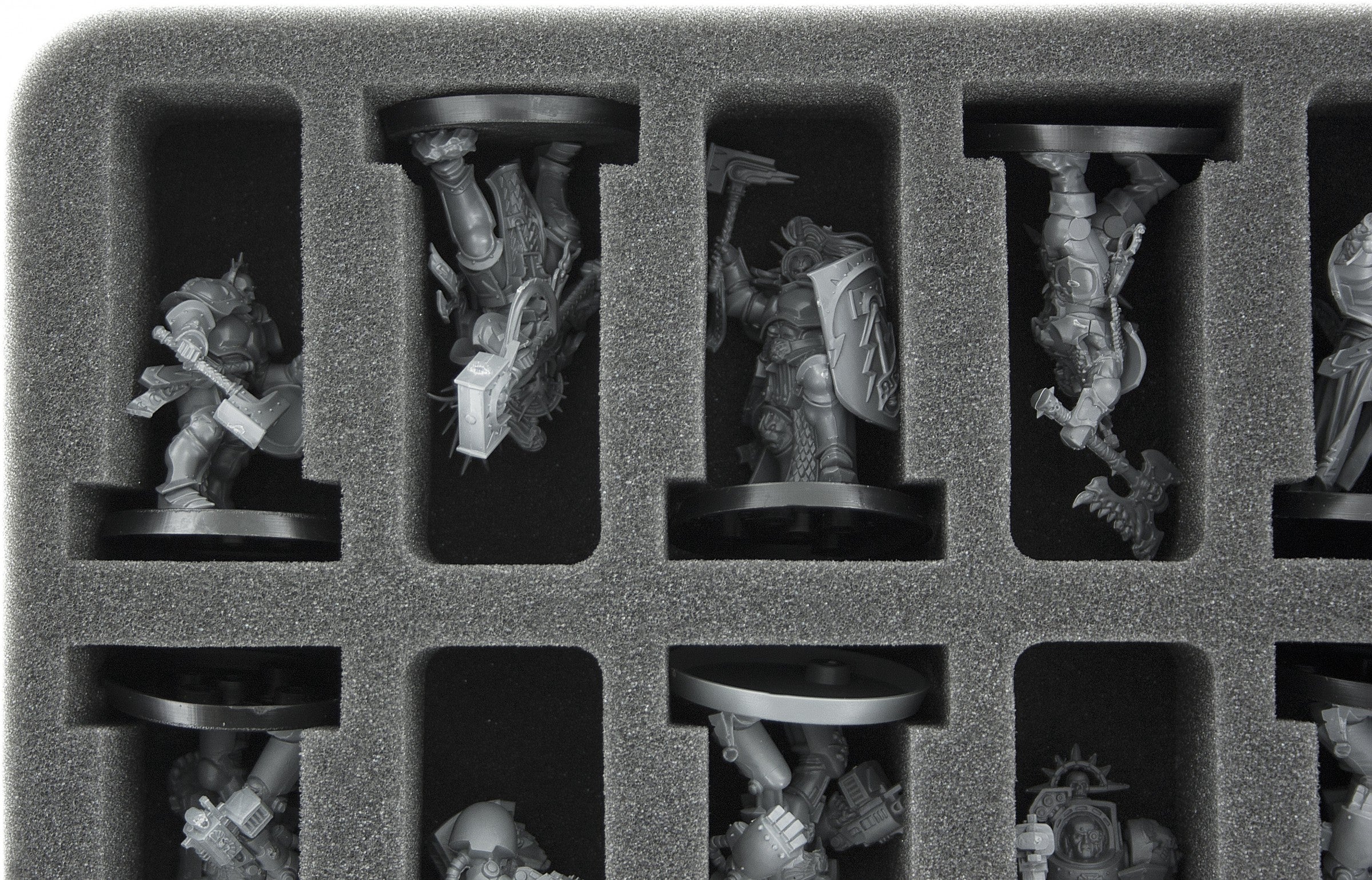Especially for miniatures with 40 mm Base. There is enough space to store 12 GamesWorkshop miniatures like Terminators or Blood Warriors.