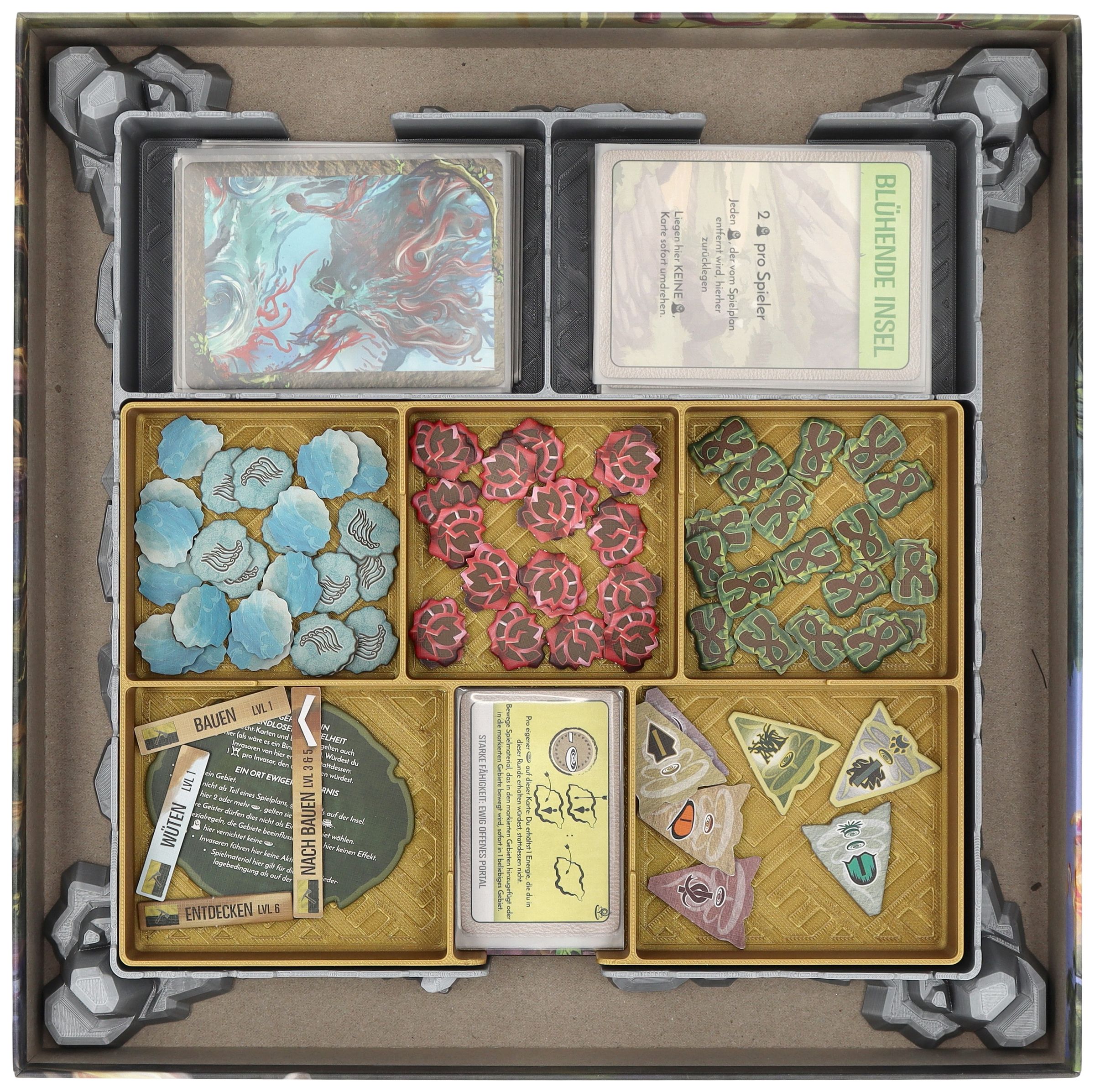 • Provides space for all game components of the expansion – from cards and tokens to the new spirits.
