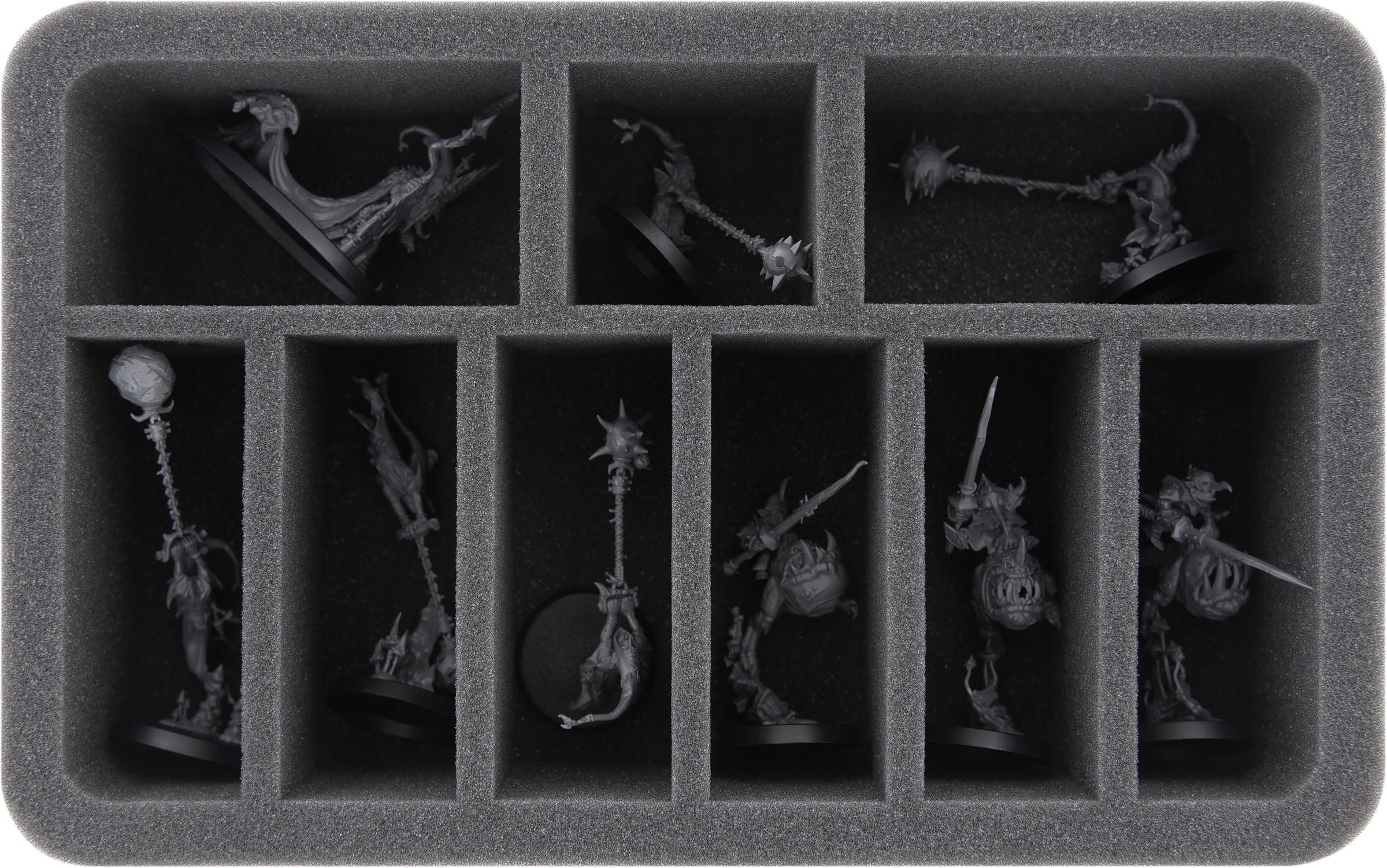 - 1 Half-Size foam trays with 9 compartments for lengthy Gloomspite Gitz models like the Loonboss, Squig Hoppers, Fanatics or Skagrott the Loonking (HS060WH56)