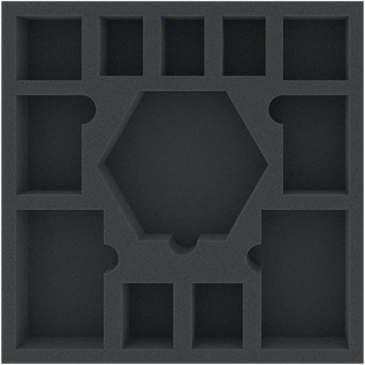 This foam tray is divided into 12 compartments of different sizes. It is particularly suitable for storing game material such as cards, tiles, dice and tokens. But also miniatures can be stored here safely.