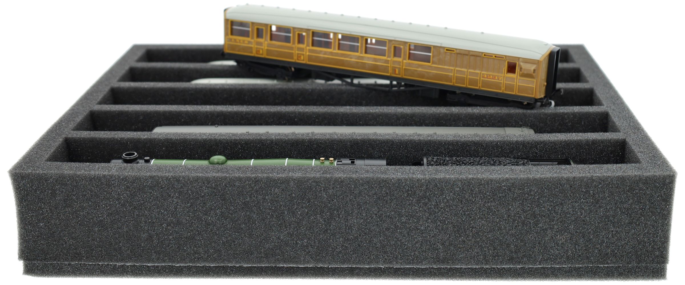 Whether for transport to exhibitions, module meetings, or safe storage on shelves at home, this insert keeps your 00 scale locomotives and cars reliably protected. The 5 compartments hold the models upright and shield them from bumps and scratches.