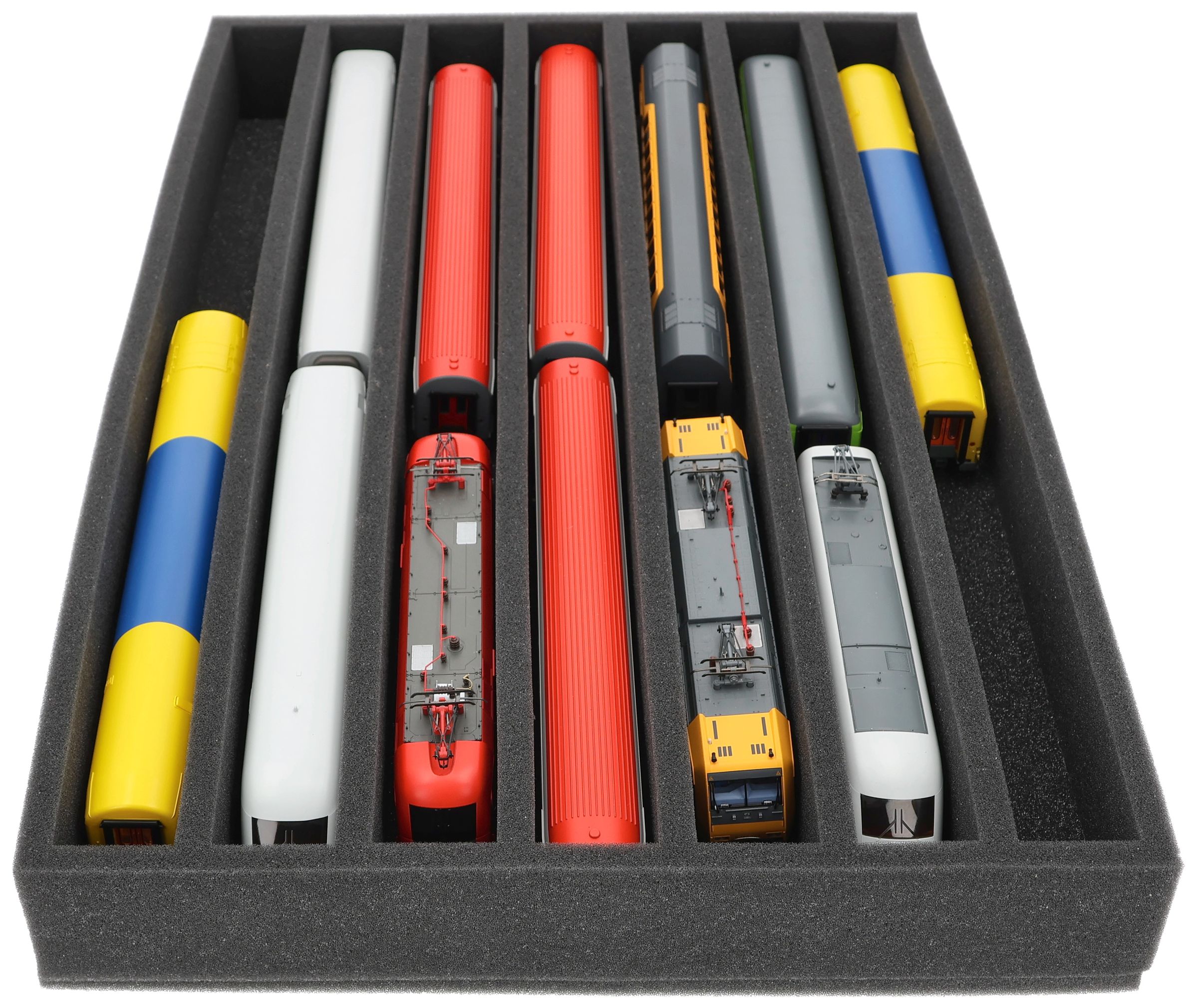 Whether for transport to exhibitions, module meetings, or safe storage on shelves at home, this insert keeps your H0 scale locomotives and cars reliably protected. The 7 compartments hold the models upright and shield them from bumps and scratches.