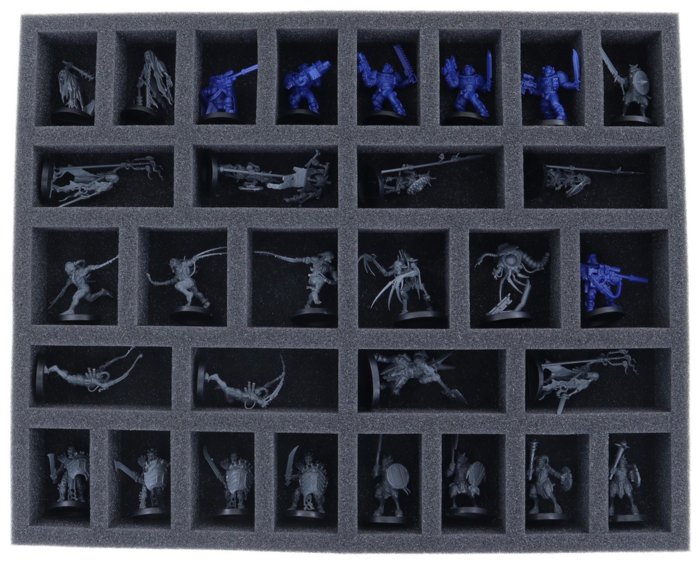 - 1 Full-Size foam tray with 30 compartments for e.g. Daemonette and bulky minis like Daemonette banner carrier, The Masque, Herald of Slaanesh (FSFJ040BO)