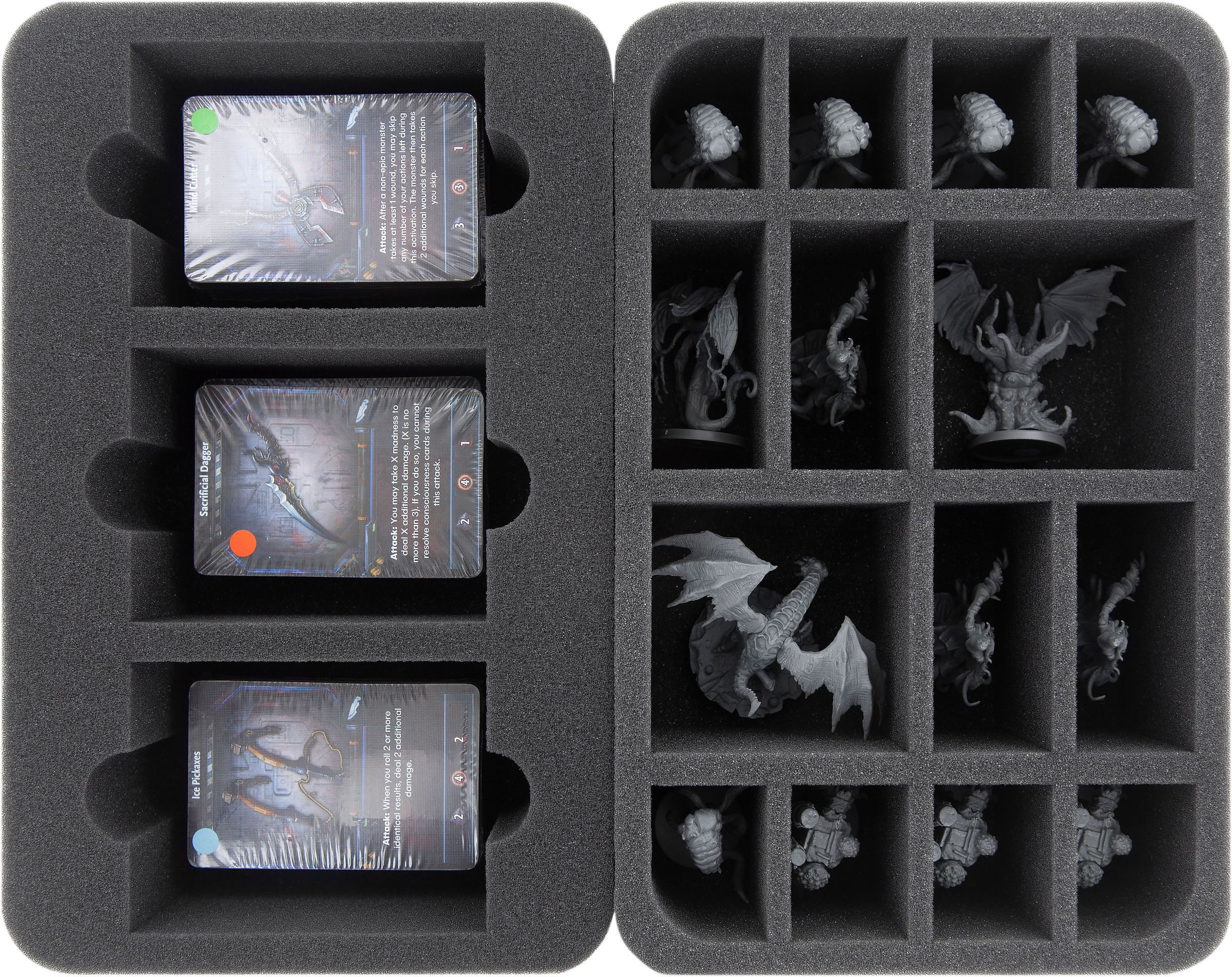 Whether Devourer of Worlds, David and Pris or Mutilation – your miniatures are safe in the fine-pored Feldherr foam. Each miniature gets its own, fitting compartment which prevents the figures from sliding around. If you painted your models you can thus be sure that the color remains unharmed. Of course, the soft foam also reliably protects delicate parts from incurring damage – Atrocity keeps its tongue, Unbound its tentacles.