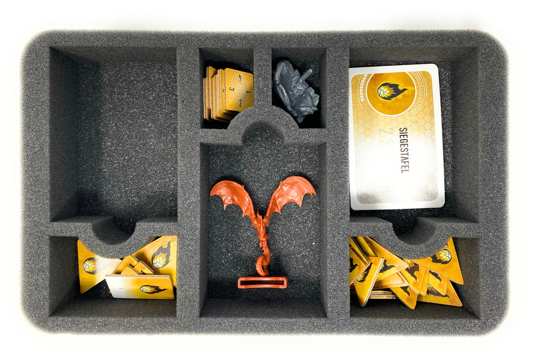 To protect your miniatures and sort your game materials, we packed 2 Half-Size foam inserts into the Storage Box. Every miniature get a custom-cut compartment.