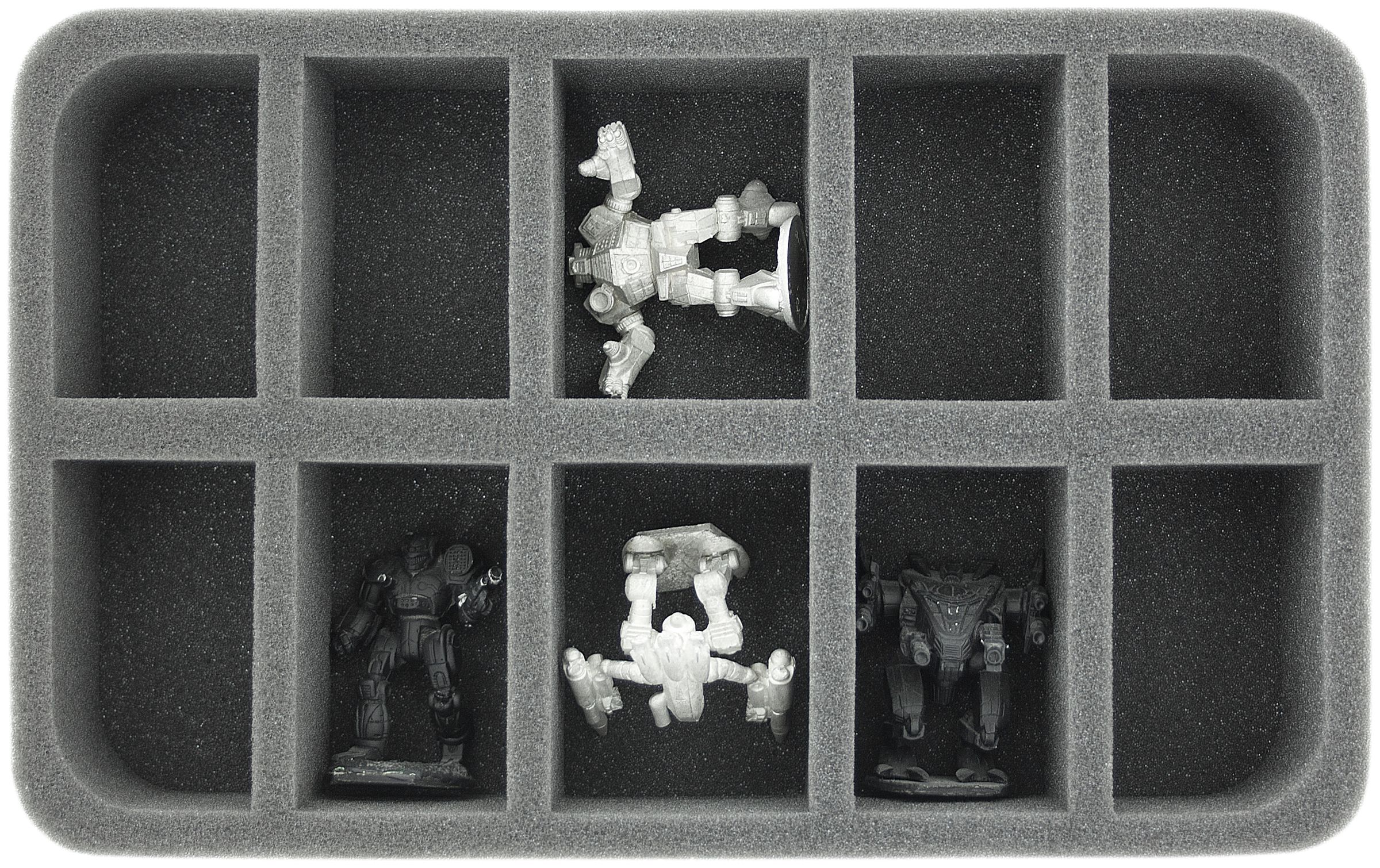 The 2 foam trays with 10 compartments each are suitable for large Mechs and will hold up to 4 lances including accessories.