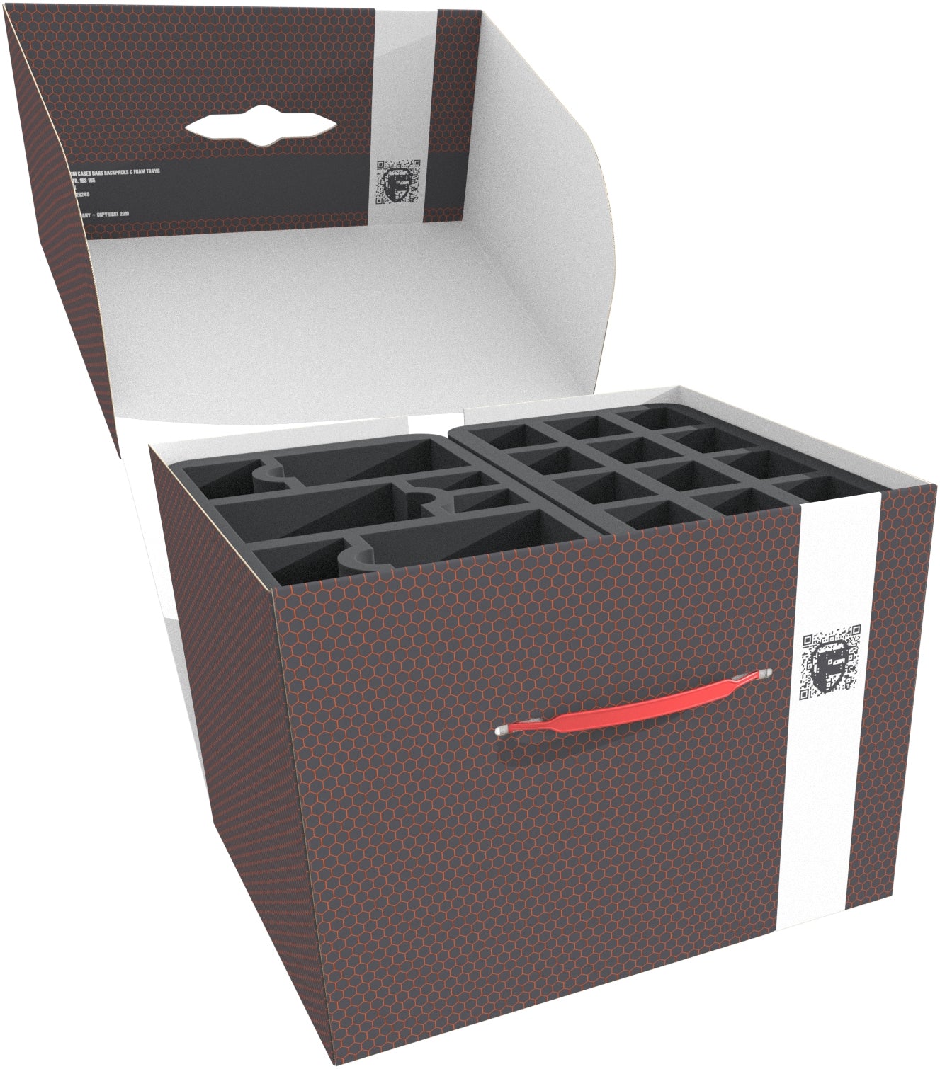 The Storage Box FSLB250 is made of coated, double-walled cardboard. This makes it not only pleasantly light but also particularly tear-resistant and stable. With the matching foam trays, miniatures and game material can be stored safely and dust-protected and can also be transported effortlessly with the plastic carrying handle.