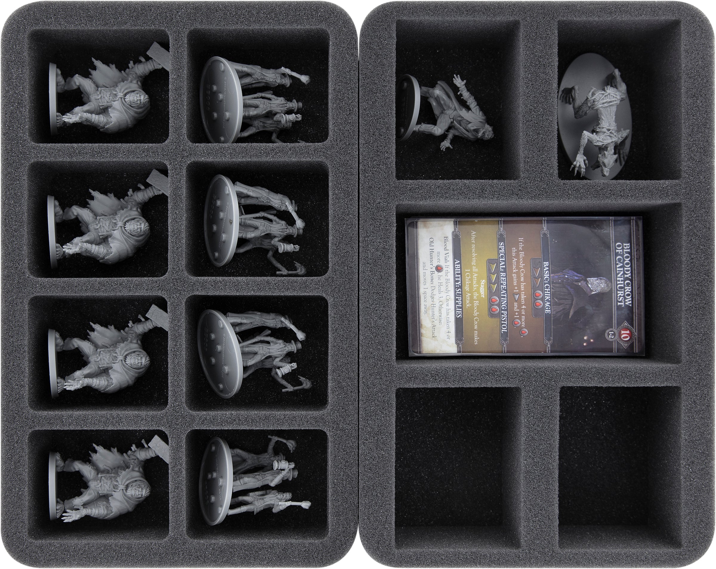 In the dark alleys of Yharnam many dangers await you. Angry mobs and mighty beasts endanger your life. Snapped-off parts, ugly scratches, and paint chips threaten your painted miniatures. To protect your miniatures, we've packed seven Half-Size foam inserts into the box. Each model, no matter if a huge Cleric Beast, one of the Hunters, or a Hunter Mob will find a suitable compartment in the box. The precisely cut compartments prevent the figures from sliding around and bumping into each other during transport. This protects filigree details and your painted models will not be affected by abrasion and scratches. Thus, you only have to fear the monsters behind the next corner.