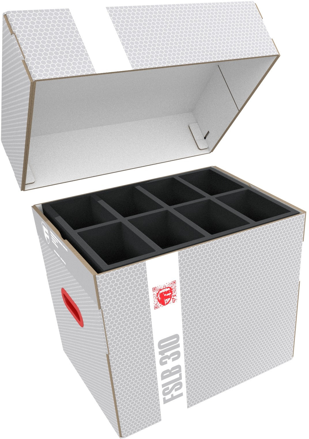 The storage box FSLB310 is made of coated, double-walled cardboard. This makes it not only pleasantly light, but also very tear-resistant and stable. The attachable lid reliably protects the contents from dust and other external influences. With the appropriate foam trays, miniatures, game material and all other goods can be stored safely - and conveniently transported with the two plastic-reinforced carrying handles on the sides.