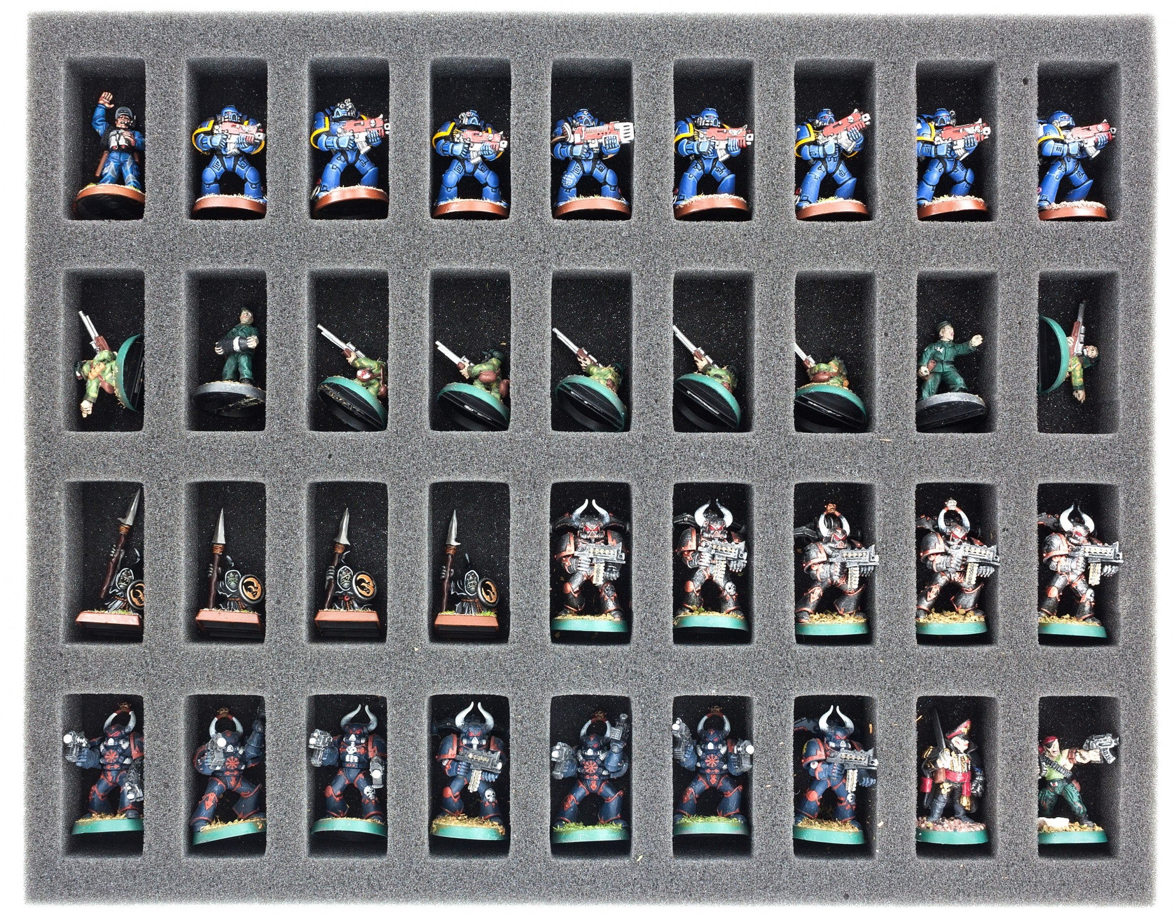 35 mm full-size foam tray with cut outs: Perfect for all standard miniatures, like Flames of War, Confrontation, GamesWorkshop and all others