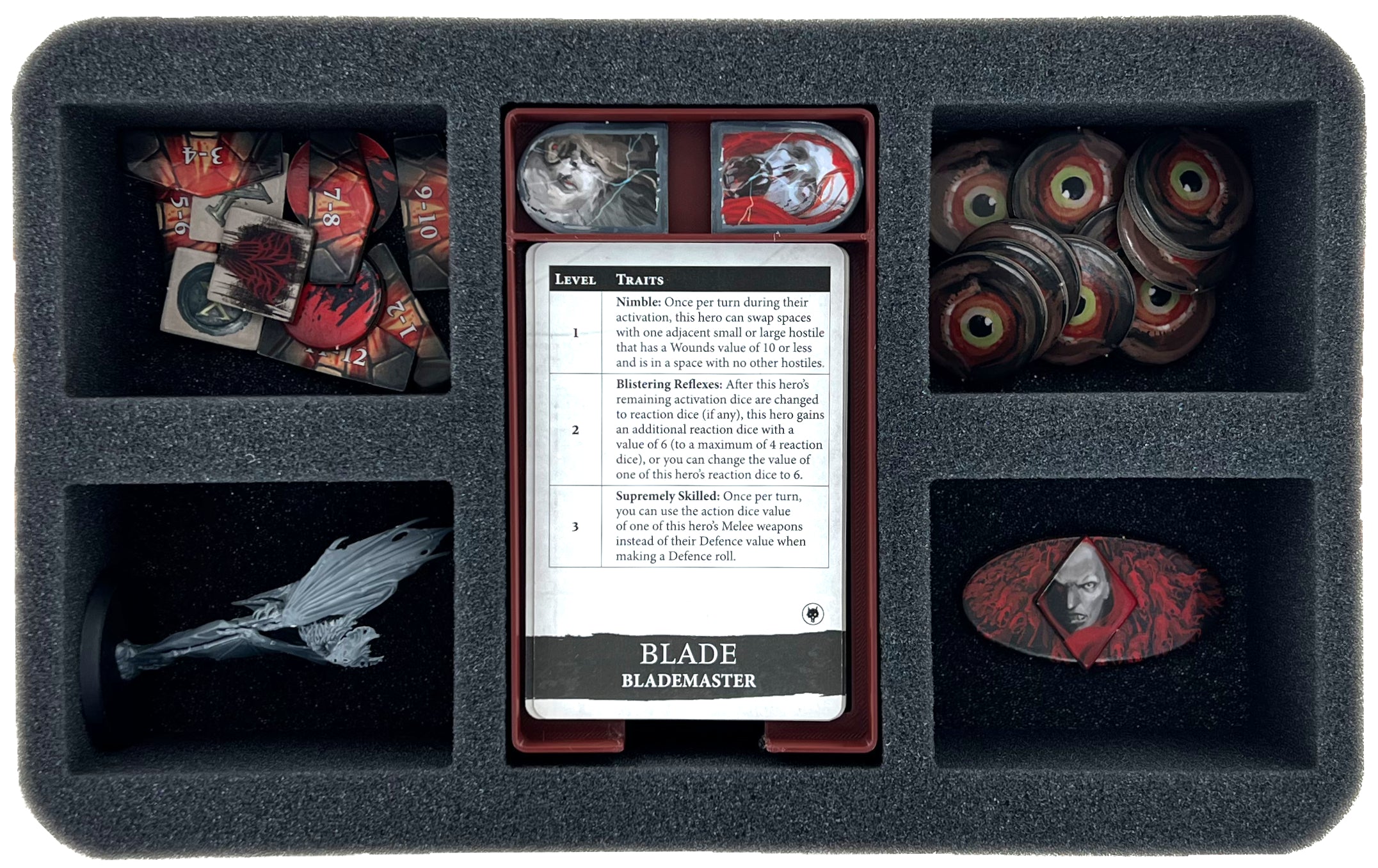 • 1 Half-Size foam tray with six compartments for miniatures like Radukar the Beast, Lady Annika, Kritza, Carmilla DuSang, and Fell Bats
