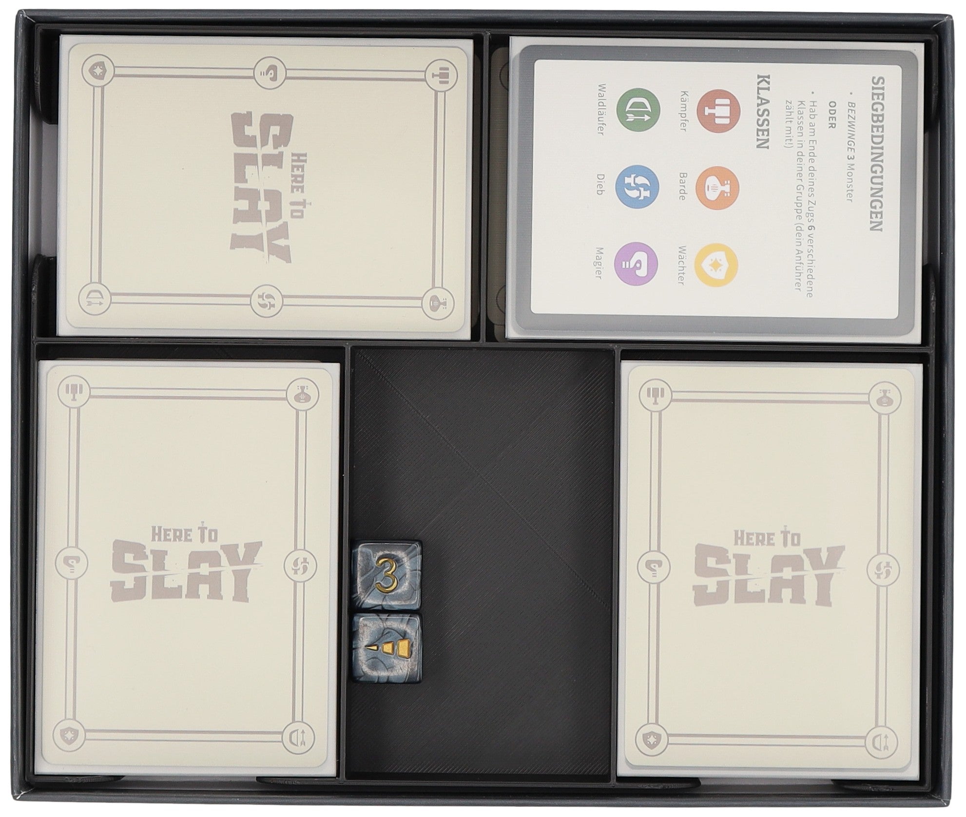- The card holder set fits exactly into the original core game box of the German 2nd edition of "Here to Slay" (dimensions of the organizer: 199 mm x 167 mm x 38 mm).