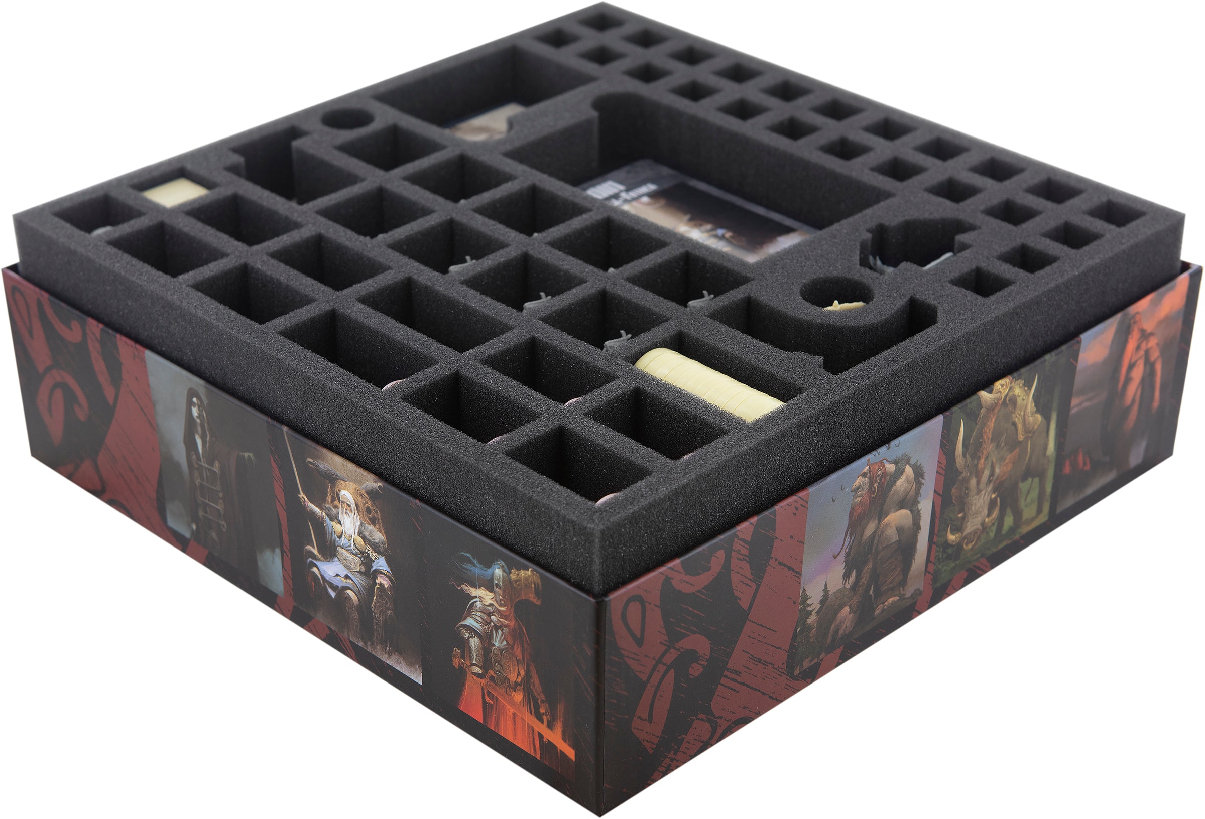 The first insert takes care of the large miniatures. From the Mountain Giantess to Tyr and Wolfwoman - every monster and God of Asgard is assigned its own tailor-made compartment. For Odin and his throne there are three compartments available. So you can store him either sitting in on his throne one compartment, or keep the throne and Odin separately in two custom-cut compartments.