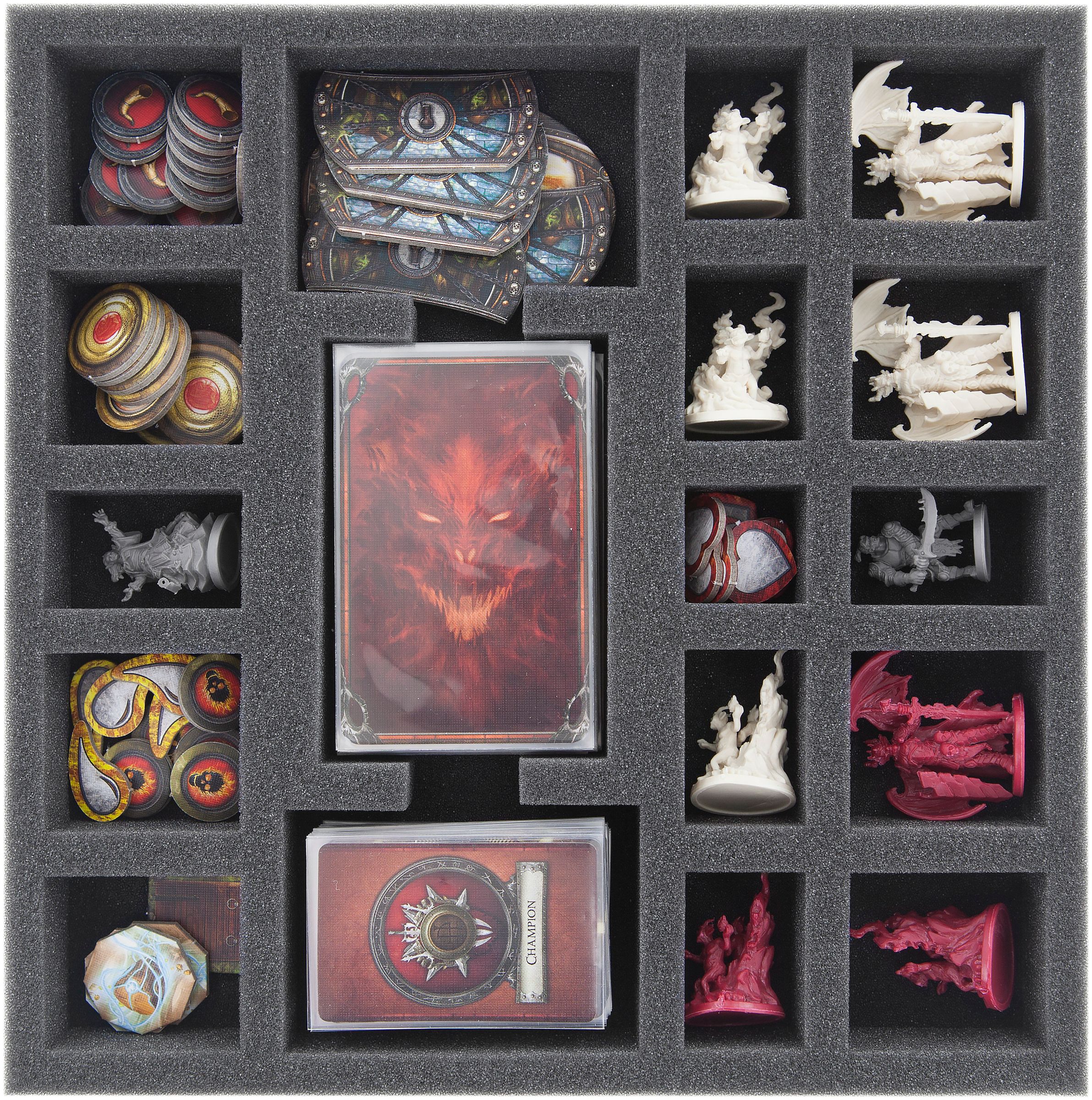 All of the ten new hero and monster characters of the expansion pack will find their safe place in custom-made compartments. This protects them from abrasion, which might be especially important for painted miniatures. It also preserves Hybrid Sentinel's wings, just like Reynart's sword from buckling or breaking off.