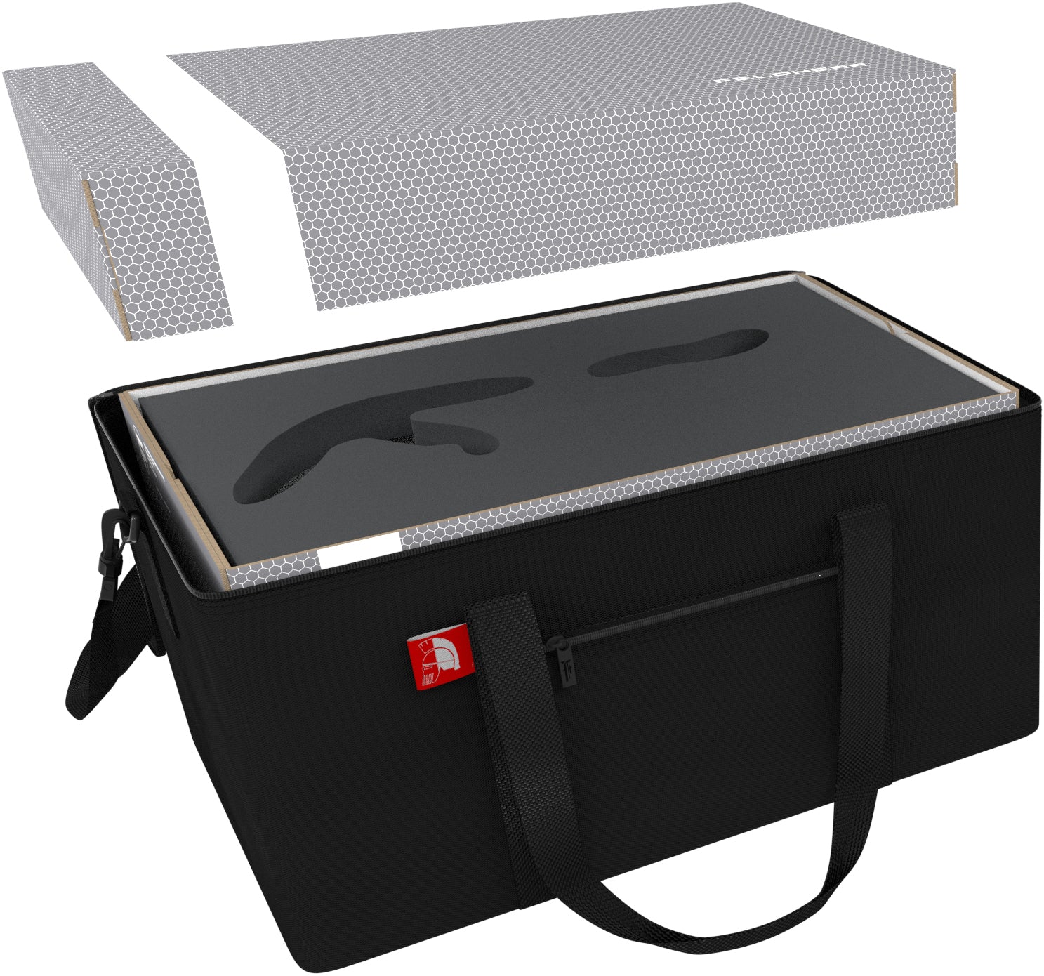 Of course, the storage box fits exactly into the Transporter bag. The bag is made of lightweight but durable fabric. In addition to the large main compartment, the bag has a small side pocket, e.g. for the Rulebook. It can be lifted with two handles or comfortably shouldered with the sturdy shoulder strap.