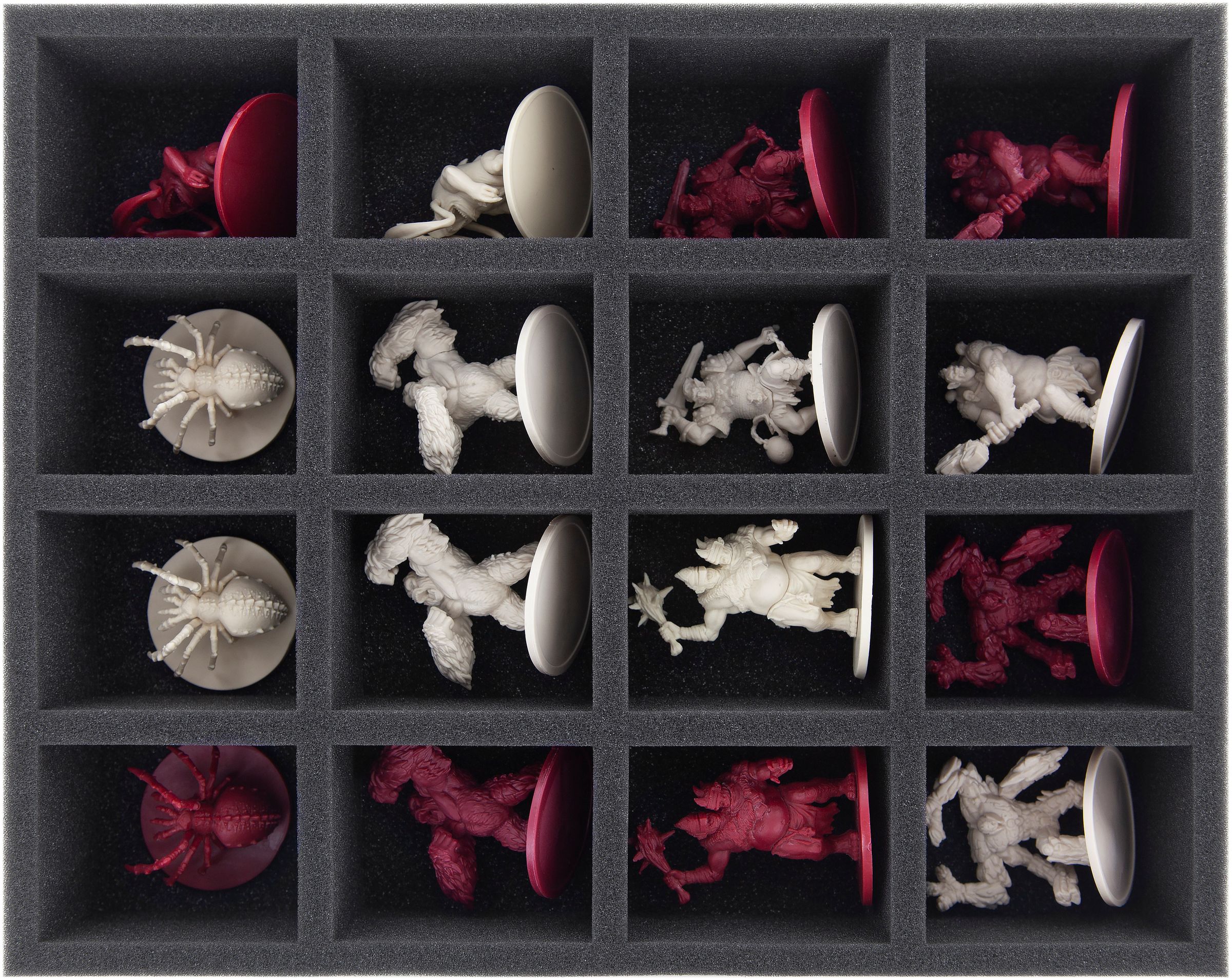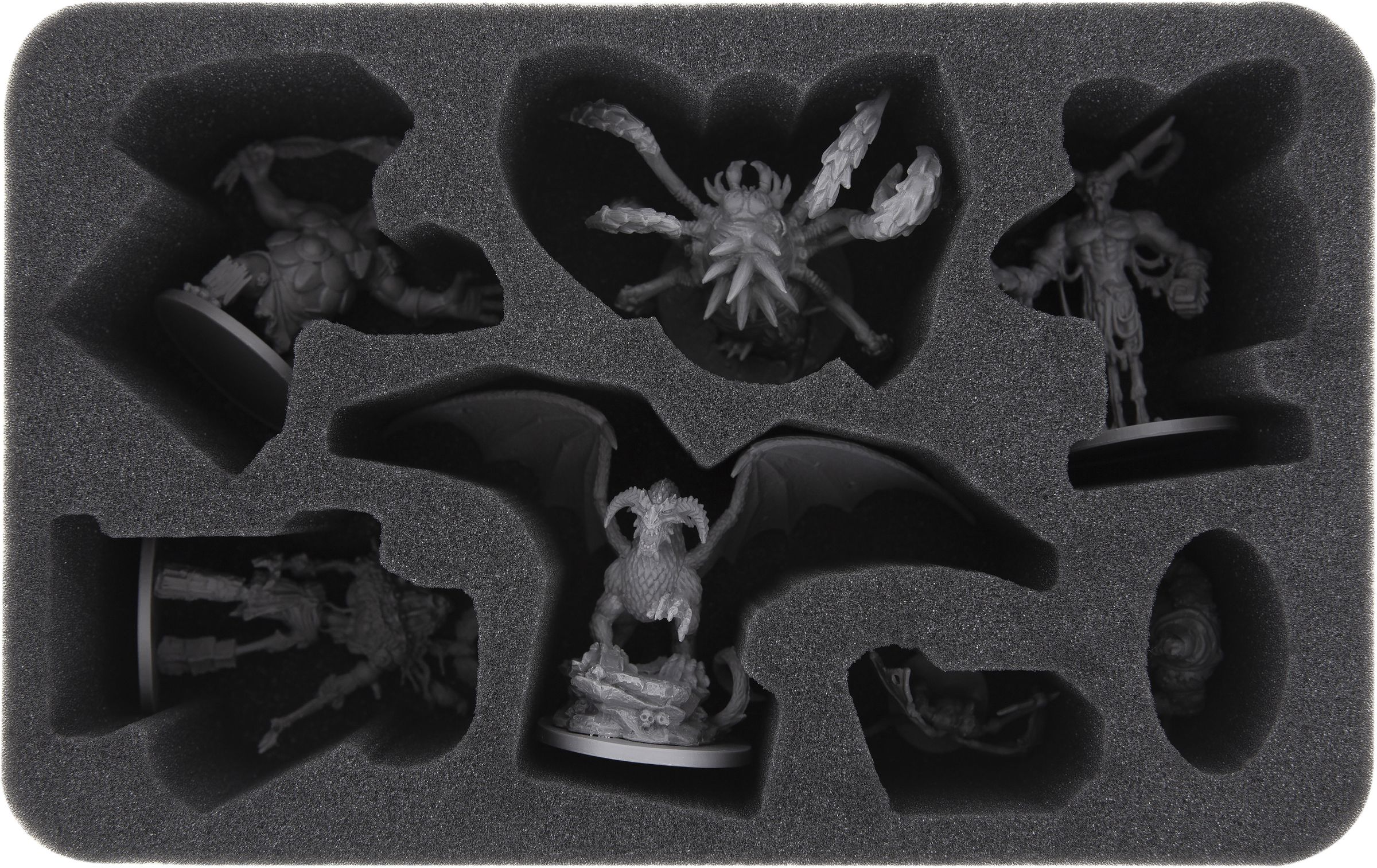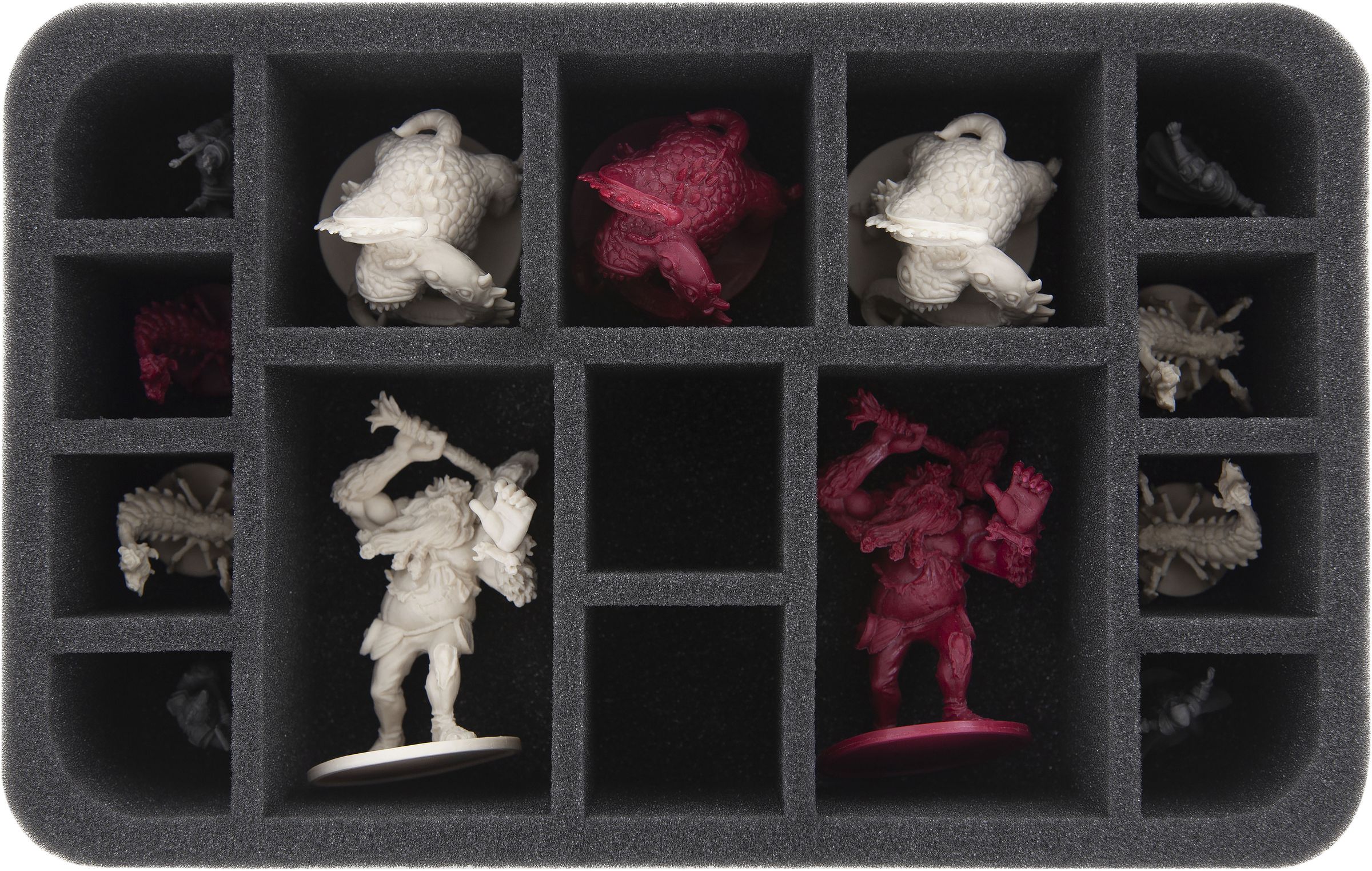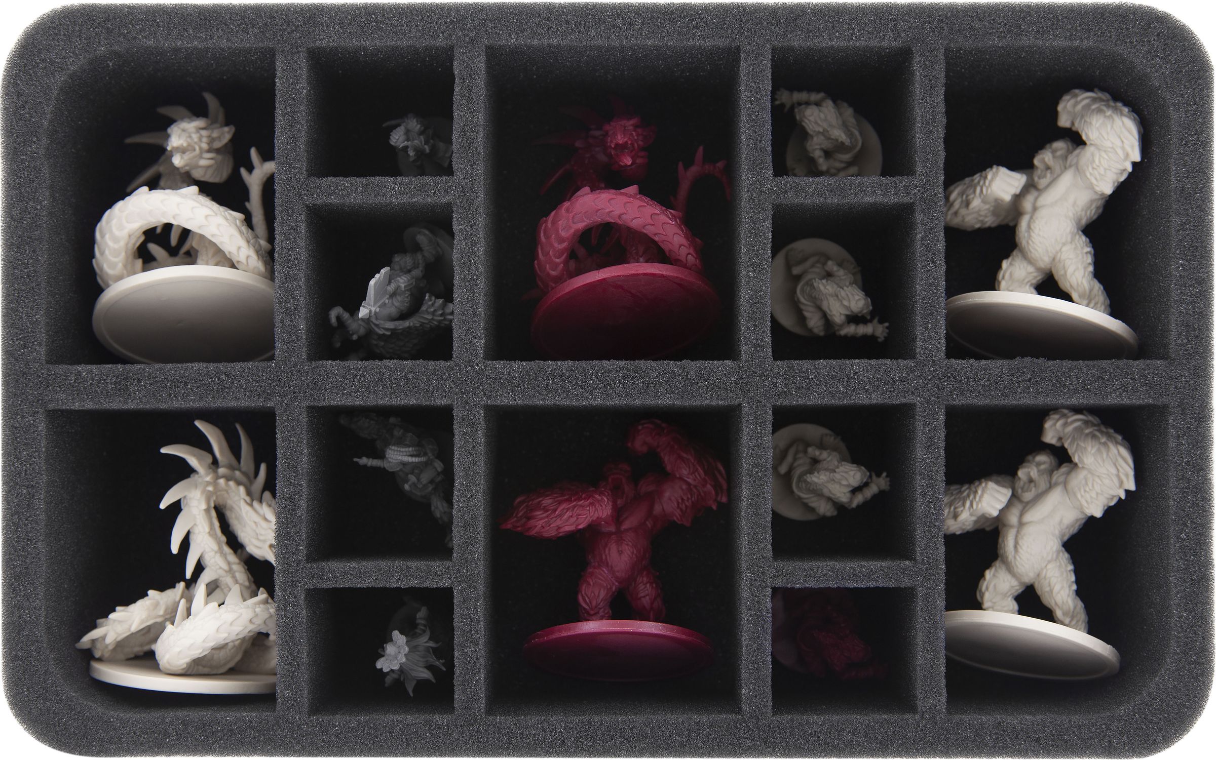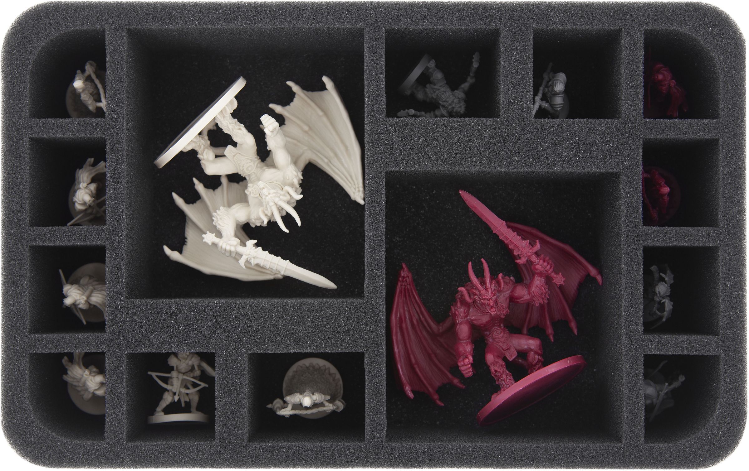 13 custom-fit foam trays ensure that all your hero and monster miniatures are padded softly. From the Shadow Dragons to the Harpies to the Cave Spiders, there is a suitable compartment for every miniature.