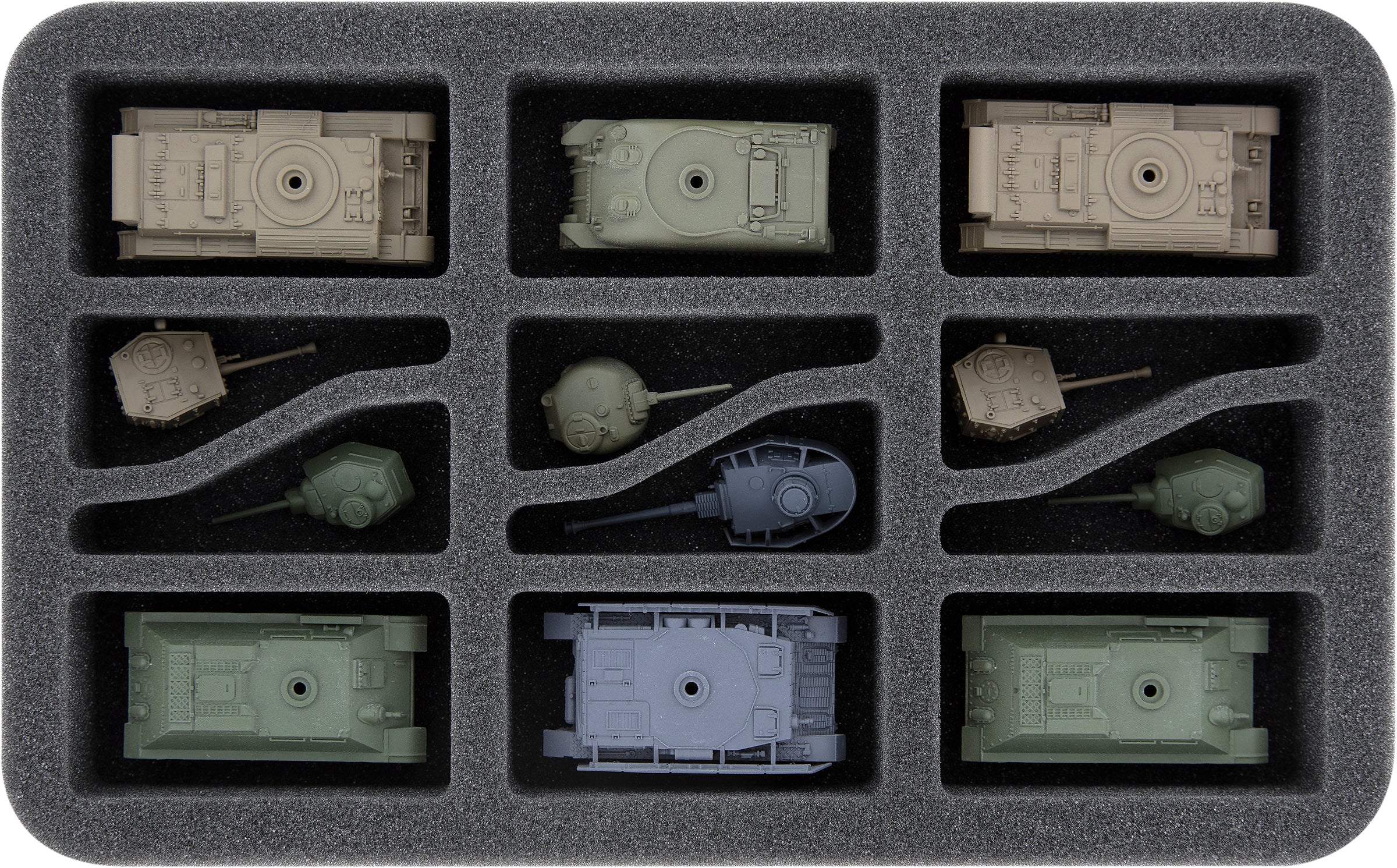 This Feldherr Half-Size foam tray has 12 compartments for the safe storage of 6 large tanks and 6 gun turrets. The fine-pored foam offers reliable protection for your models – delicate parts stay intact, sensitive surfaces remain free from scratches and abrasion.